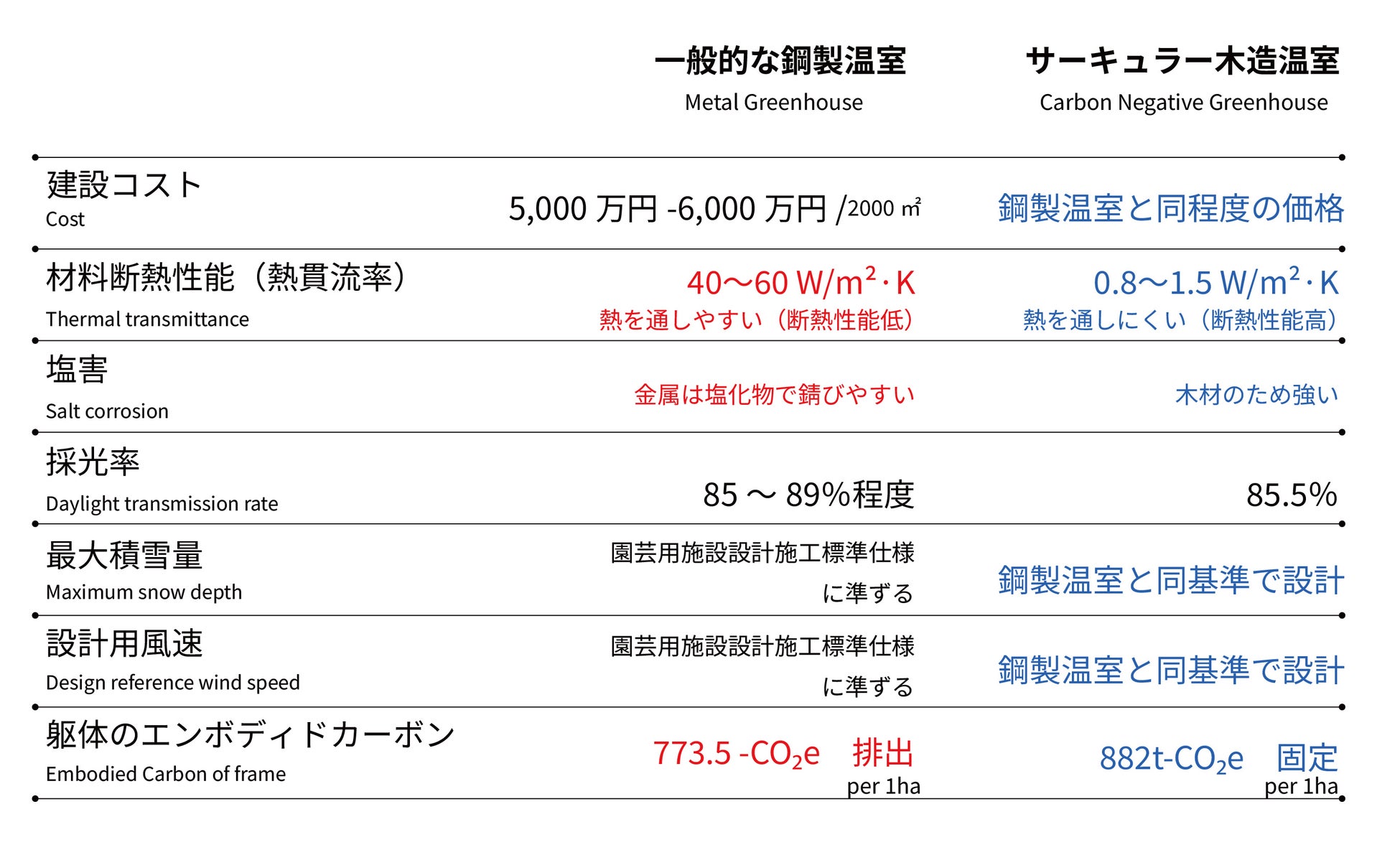 また建設コストや採光、強度は鋼製温室と同等としながら、木造が本来もつ断熱性・調湿性・耐塩害性を活かし、長期的な利用やエネルギーコストの削減が期待できます。