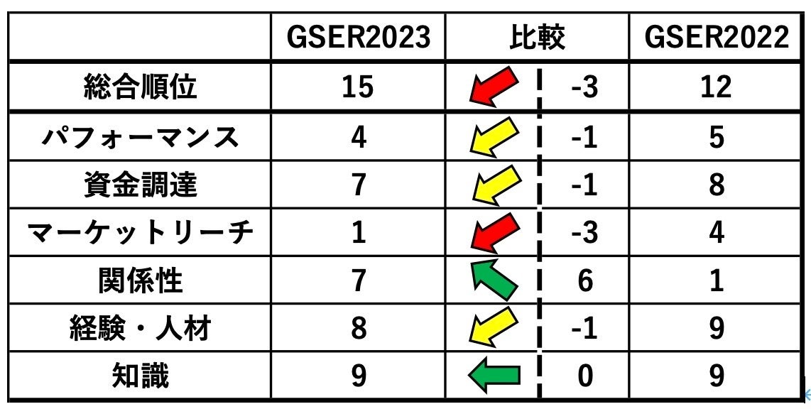 • 一方、国内外市場におけるスケールアップやユニコーン輩出状況などに基づく「マーケットリーチ」は、2022年の4点から最下位点の1点と順位を下げた。その他「パフォーマンス」も順位を下げており、これらが総合順位の低下に繋がったものと想定される。