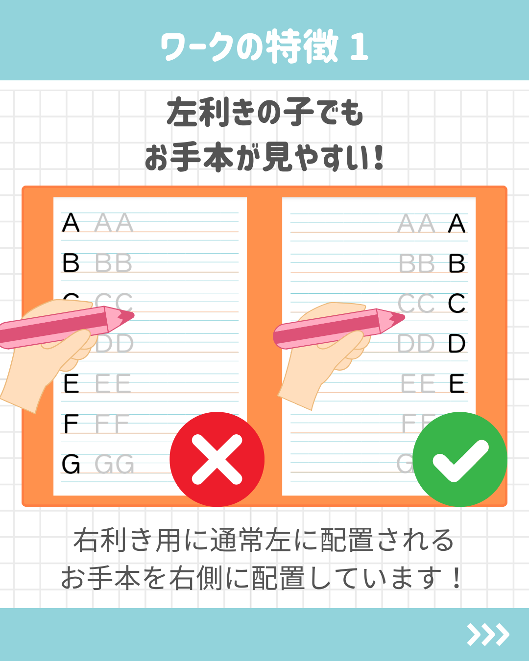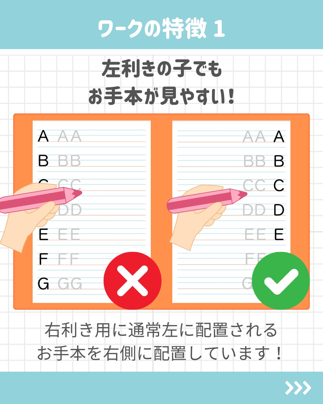 ですがその場合、左利きの子供は文字を書く自分の手でお手本が隠れてしまいます。