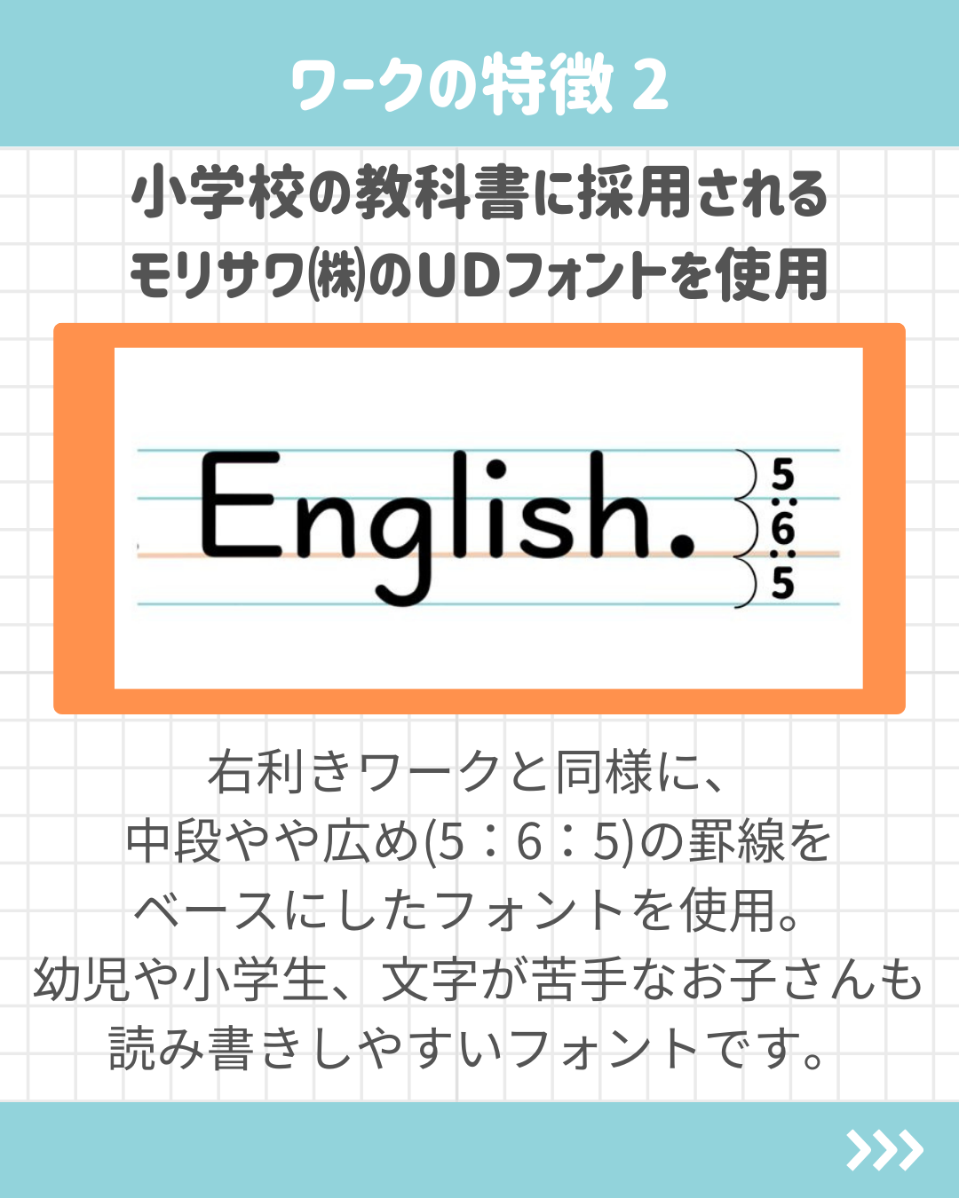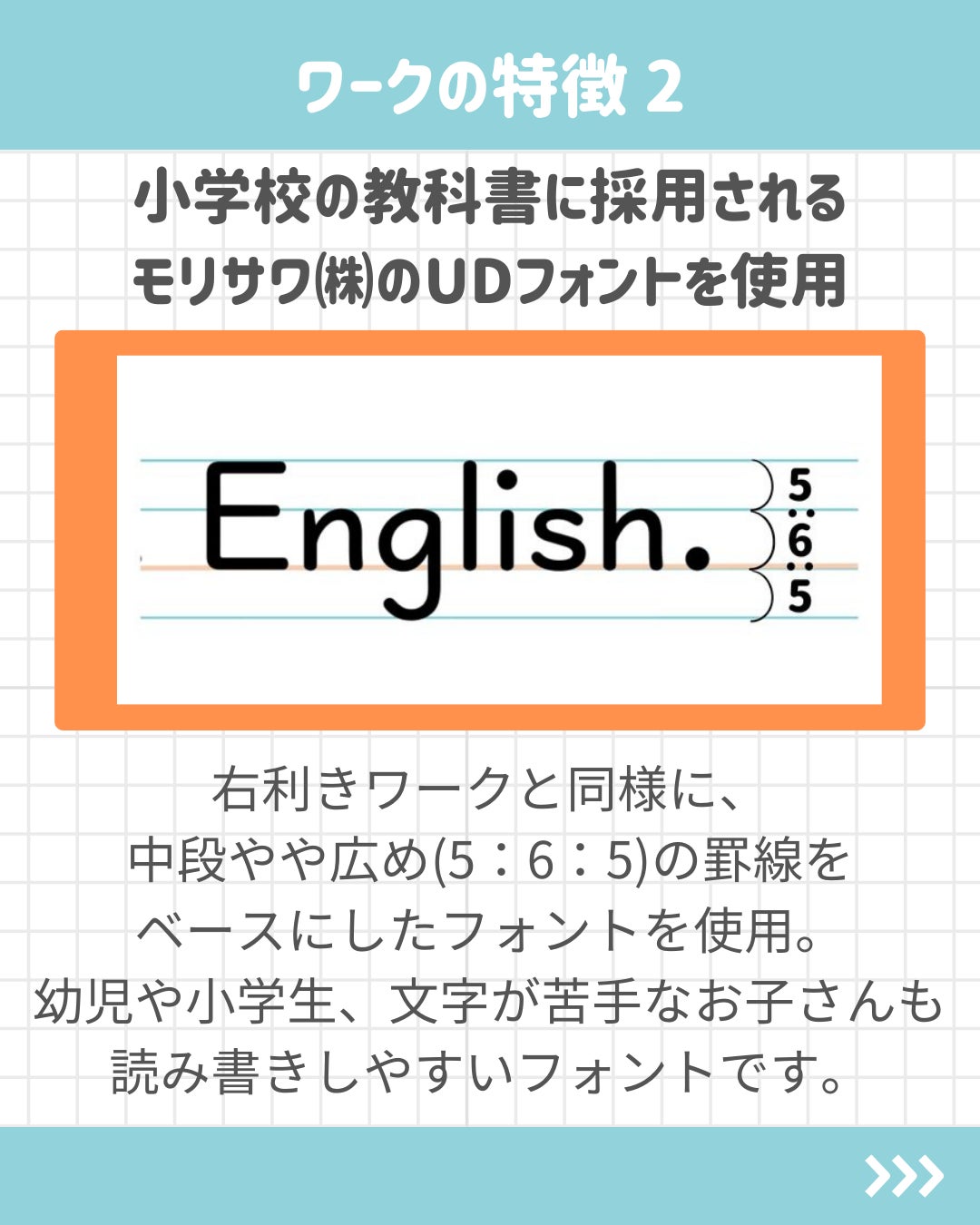 「こども英語LABO」に新しく追加された左利き用ワークはお手本が右側に配置されているため、左利きでもお手本をしっかり見てアルファベットの練習ができます。