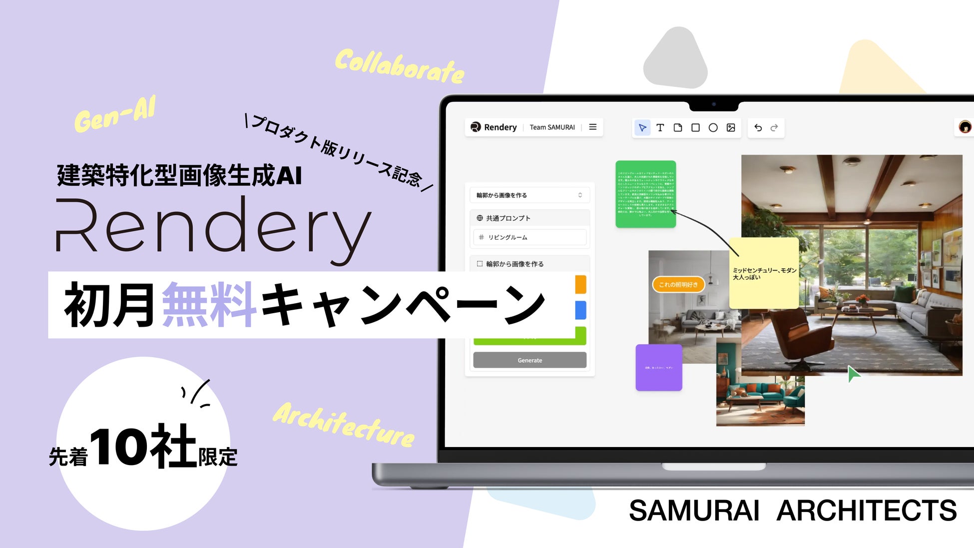 株式会社SAMURAI ARCHITECTSは、建築家、設計士、デザイナー、営業等の建築プロジェクトに関わるすべてのステークホルダーを対象に、画像生成AIを用いてリアルタイムコラボレーションすることを可能にする革新的な画像生成AIサービス「Rendery」を正式リリースさせていただきました。本サービスを用いることでパース作成に費やす手間とコストを大幅に削減、建築プロジェクトの円滑な進捗に役立てる事が可能になっております。この度はリリースを記念いたしまして先着10社様限定でのキャンペーンを実施させていただきたいと思います。