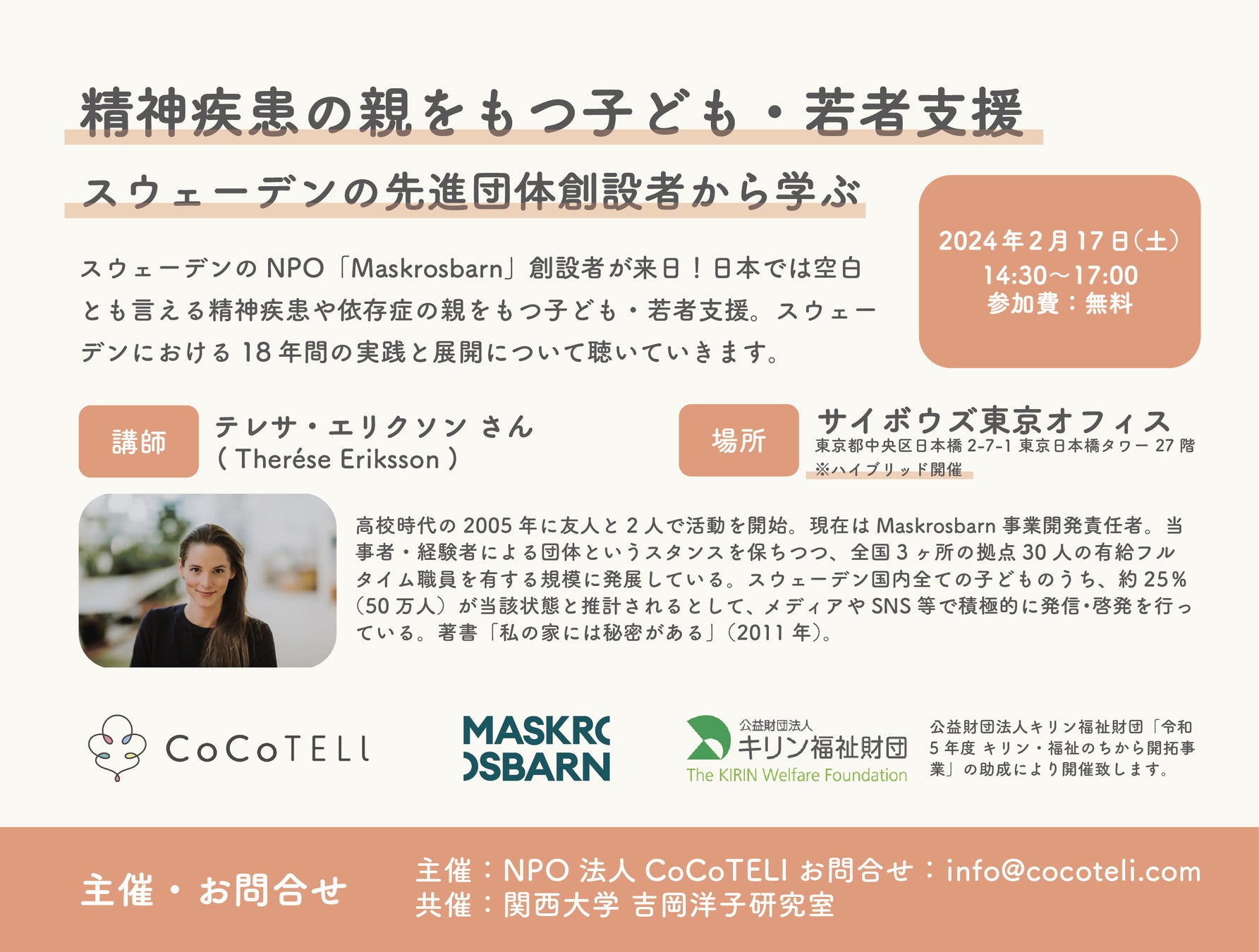 【イベント】2/17(土)14:30〜17:00 サイボウズ東京オフィス 精神疾患の親をもつ子ども・若者支援団体「Maskrosbarn」の創業者をスウェーデンよりお招きし、イベントを開催いたします。