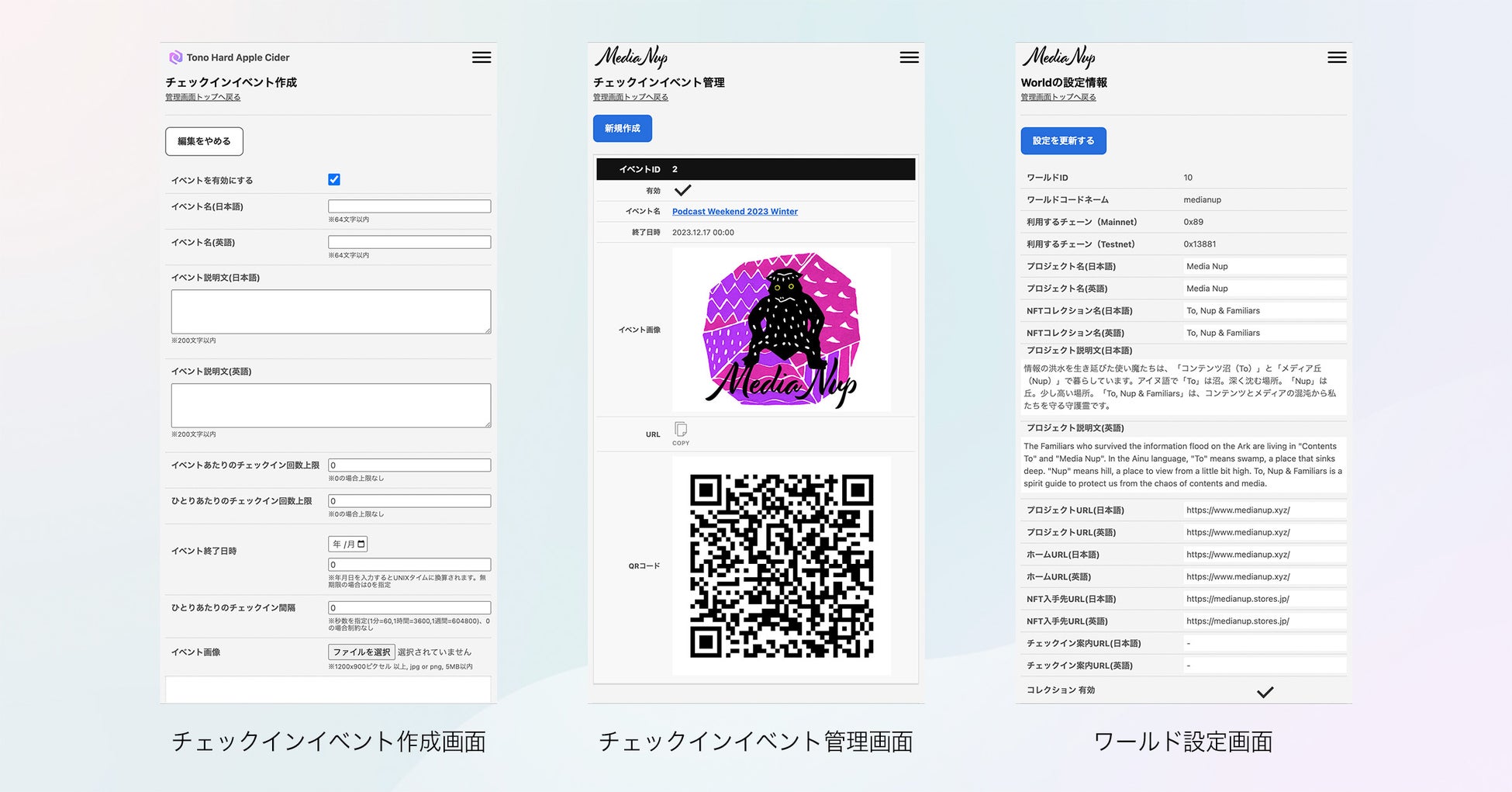 加えて今回は、「プロジェクト運営者向けの管理画面」と、「他サービスで発行済のNFTにチェックイン等の機能を加えるAdapter機能」を追加しました。「thirdweb」をはじめとするNFTサービスで発行されたNFTにも、T&T独自の機能を付加することができます(テクニカルホワイトペーパーによる技術詳細)。