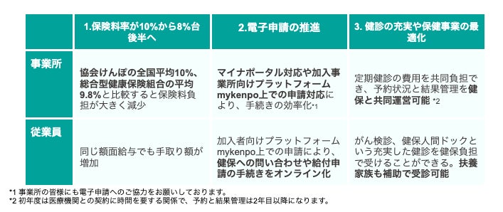 当健保では加入事業所と加入者の双方に「費用負担の軽減」「手続き負担の軽減」「健診の充実」の3つのメリットを提供します。