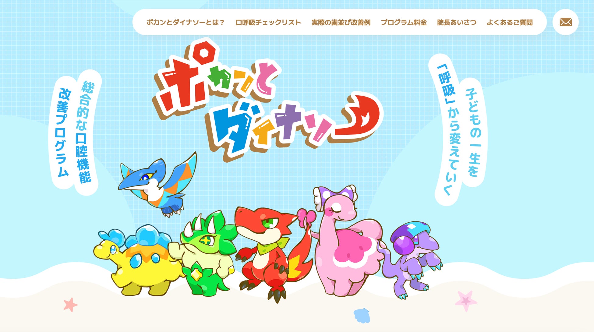 歯並びが悪くなる原因にフォーカスし、原因を把握、原因を改善することで、お口の機能と歯並びを整え、健康的な心身を身につけることを目的とした新しい口腔機能改善プログラム「ポカンとダイナソー」(商標登録)。「悪くなった歯並びを治す」対処療法ではなく、「悪くなる習慣や機能を改善する」 原因療法にフォーカスしたプログラムについて詳しく紹介しています。今後は随時、ポカンとダイナソーについての新着情報なども発信してまいります。
