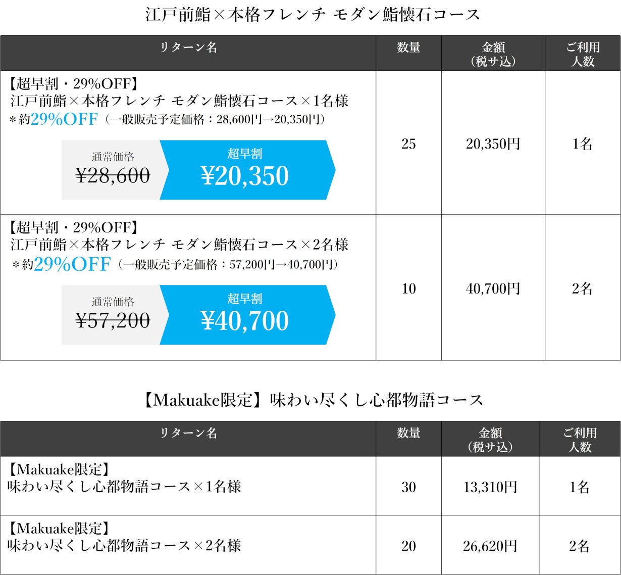 今回、そんな割烹スタイルの当店が、コンセプトを広く体験頂く為にマクアケ限定で、江戸文化にルーツを持つ「江戸前鮨」とフランス文化の中心「フレンチ」を融合した、特別コース「モダン鮨懐石コース」と、和食とフレンチの融合を体験できる「味わい尽くし心都物語コース」をご用意致しました。是非この機会に広く皆様に体験頂きたいと考えております。