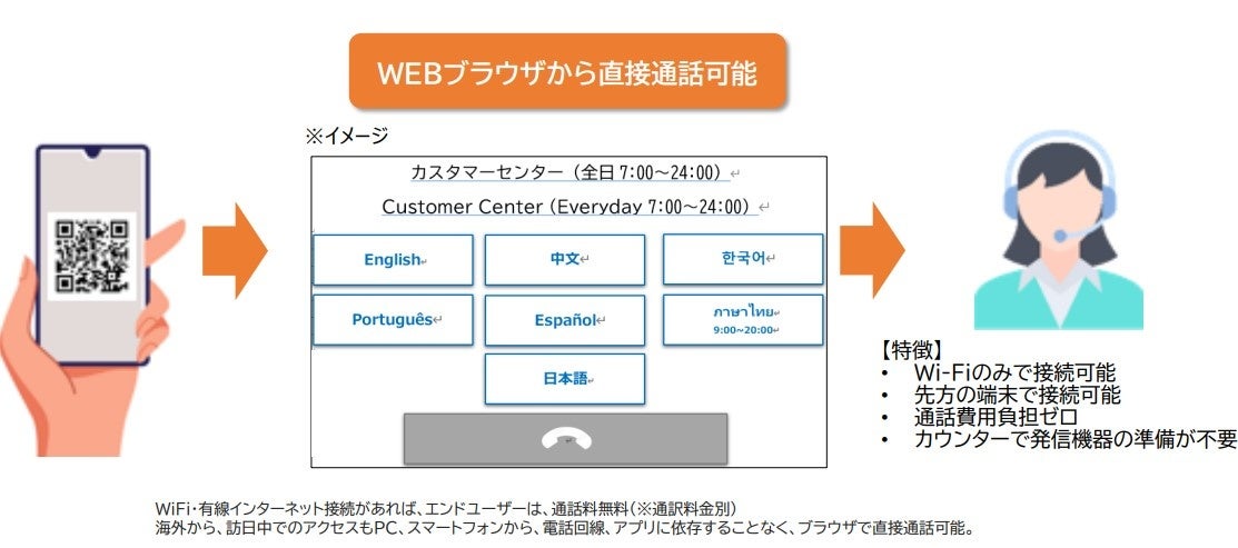 Qlick LinQ は、特別なソフトウェアやアプリをインストールすることなく、WEBブラウザを通じて、利用者が無料音声通話ができるサービスです。これを活用して、ウェブサイトに「外国人専用ダイヤル」のボタンを設置することができます。外国人がこのボタンをクリックすると、日本語がわからない方向けに、即座に通訳者とつながることができ、円滑なコミュニケーションが可能となります。アウトバウンド渡航者の方も海外先から、訪日中でのアクセスもPC、スマートフォンから、電話回線、アプリに依存することなく、ブラウザで直接通話が可能です。
