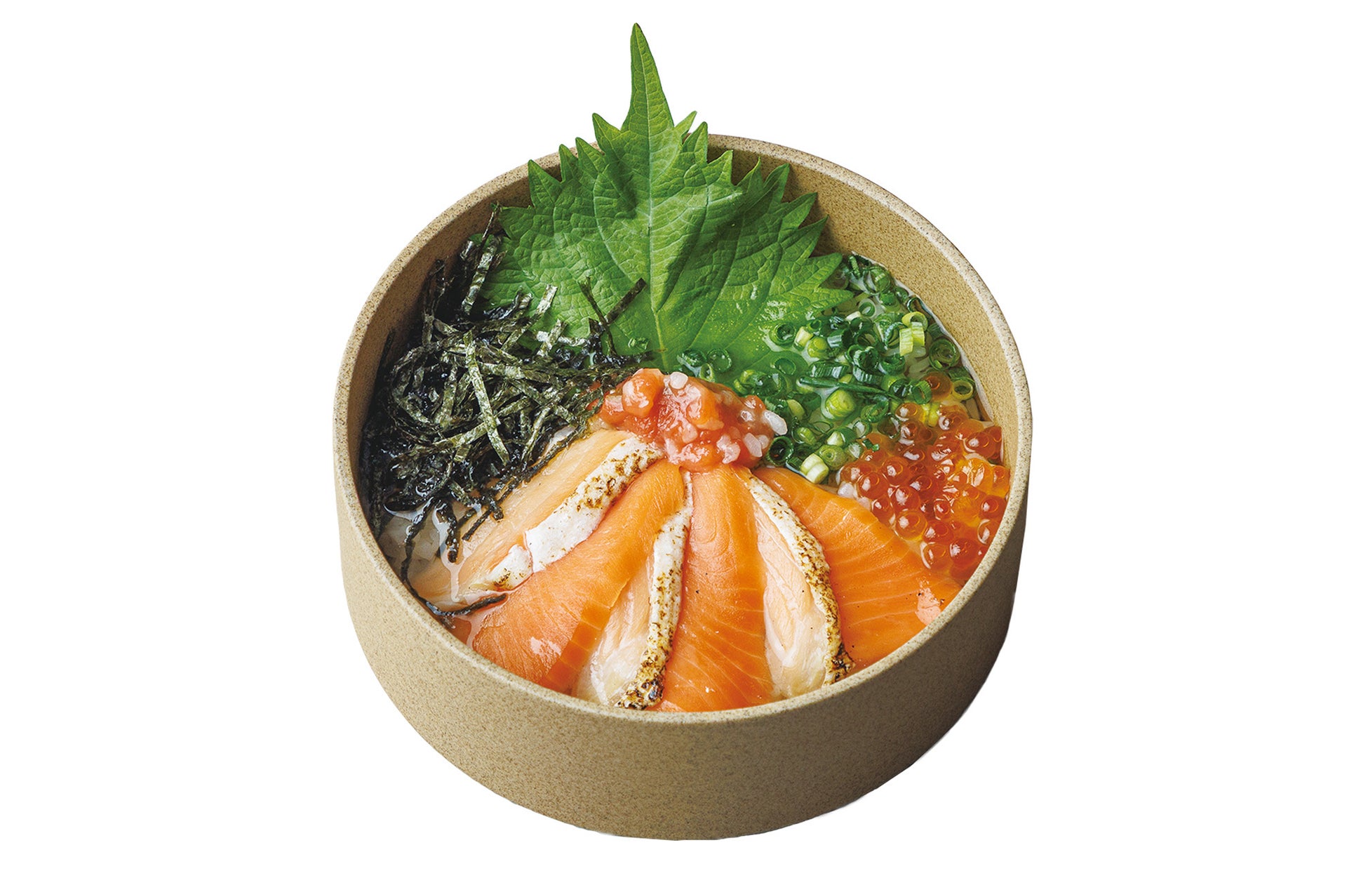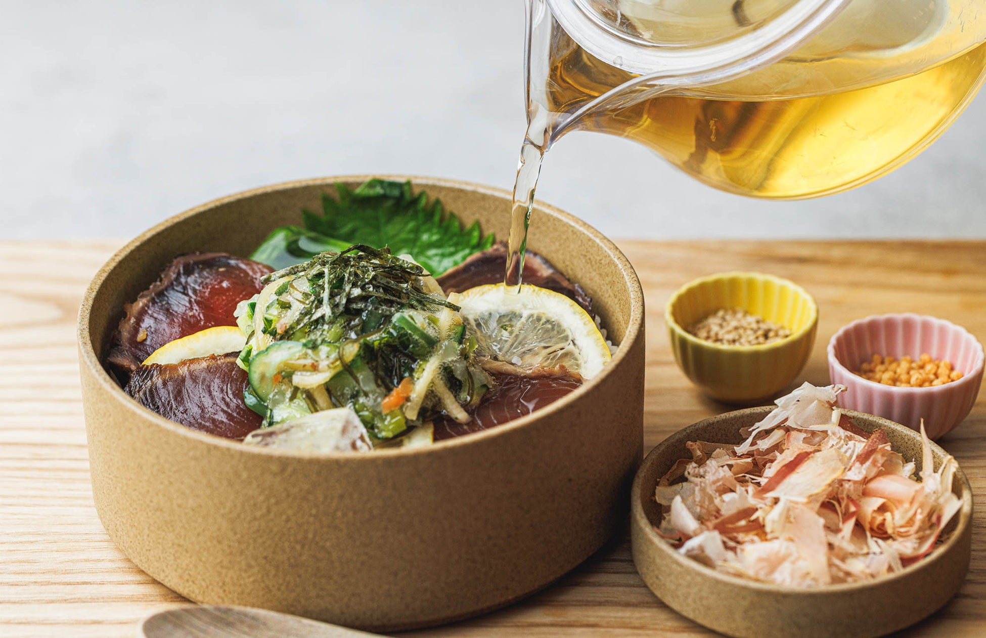 生姜とレモン香る特製だれに漬けた鰹のたたきをたっぷりのせた冷やし茶漬け。大葉や、きゅうりを加えた生姜昆布が、全体を爽やかな味わいにまとめます。