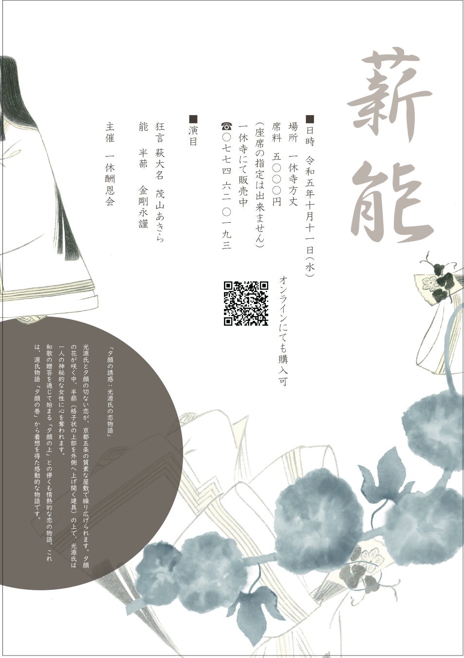 薪能発祥の地としてしられる京都は京田辺市一休寺で今年も薪能を開催します。今年度はコロナ明けての開催にあたり100席、一般にも開放。チケット販売がオンラインにて先行して販売開始いたしました。