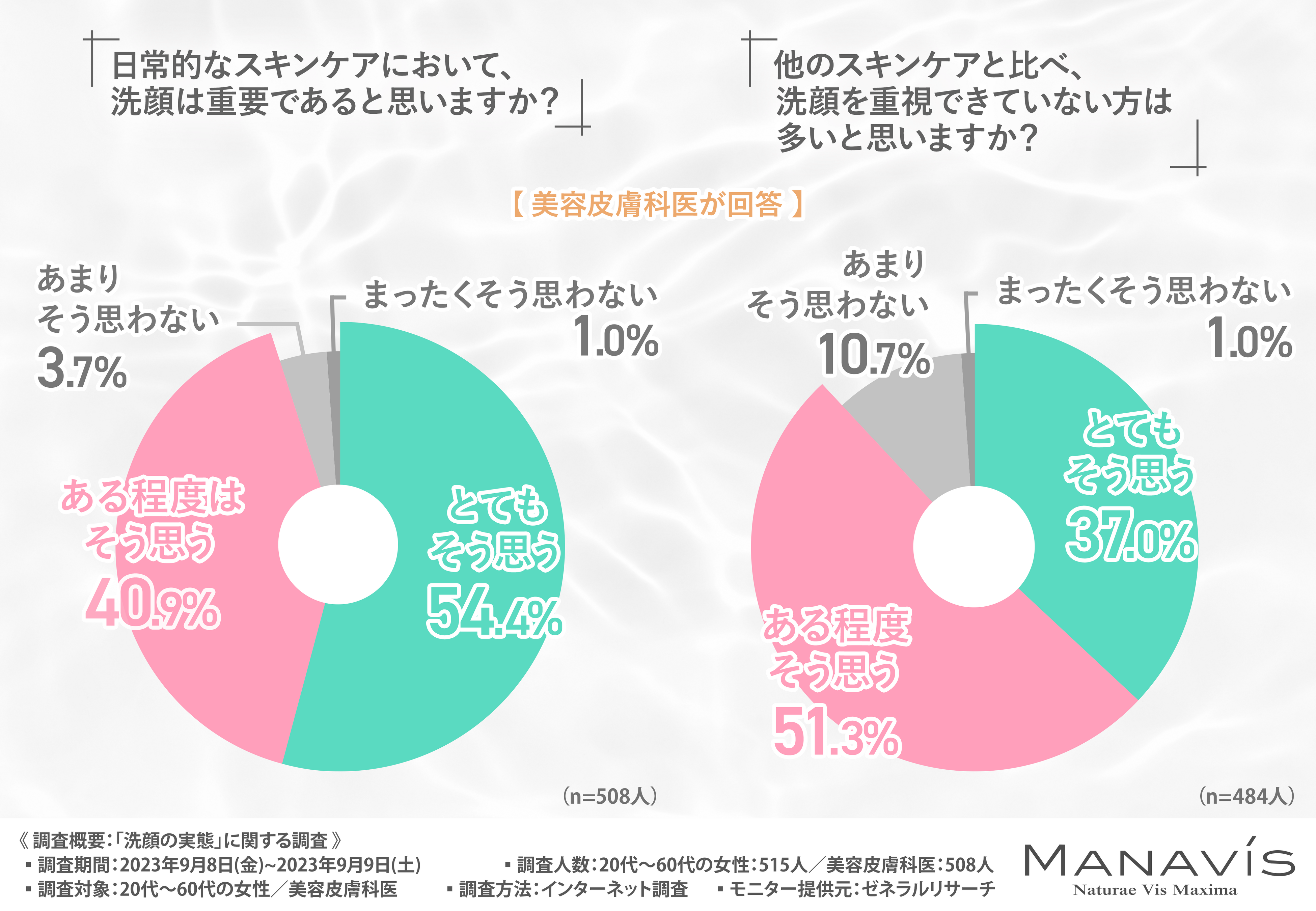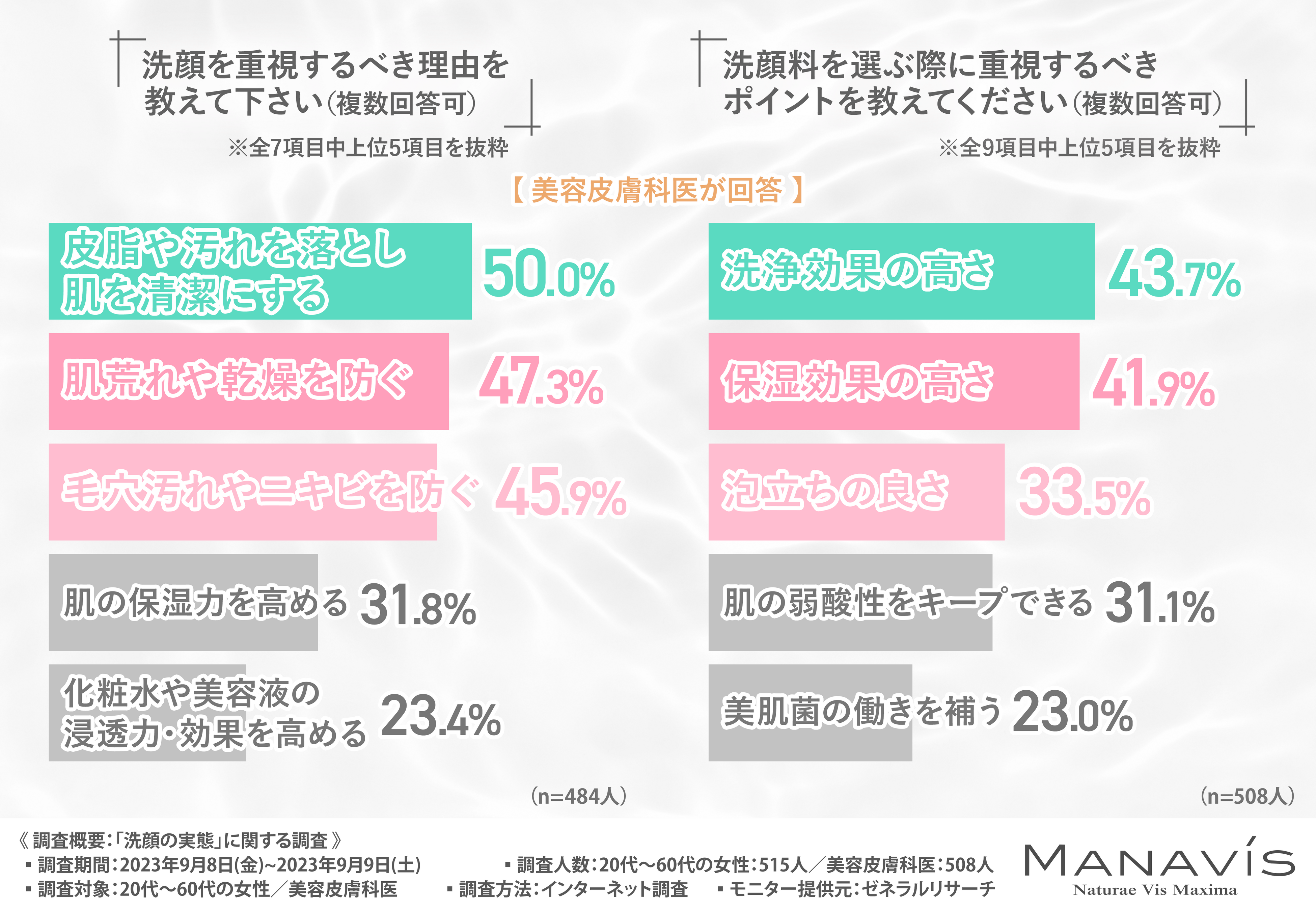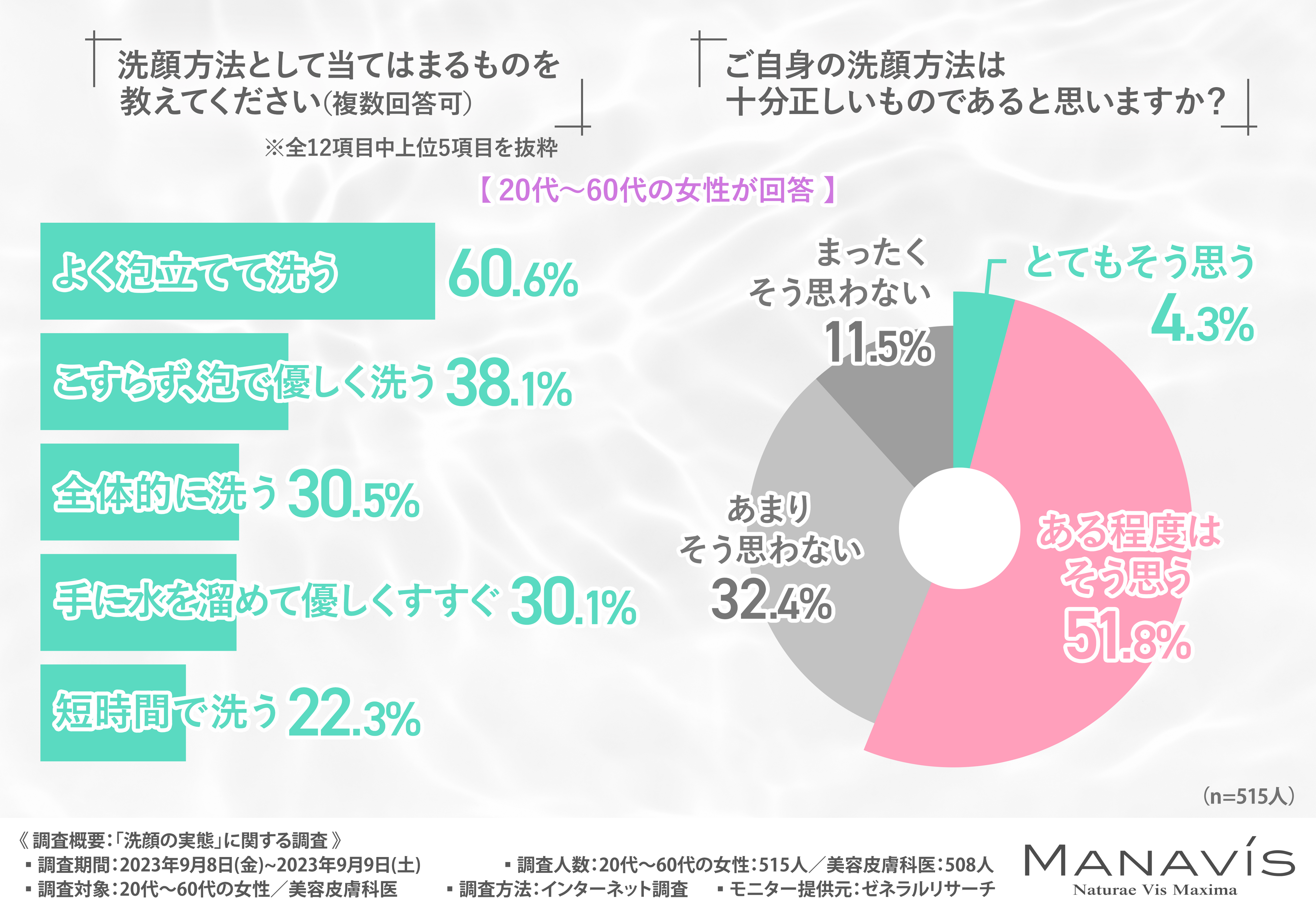 そこで今回「マナビス薬用スキンウォッシュ」(https://manavis.store/products/018)を展開する株式会社マナビス化粧品は、20代〜60代の女性と美容皮膚科医を対象に、「洗顔の実態」に関する調査を実施しました。