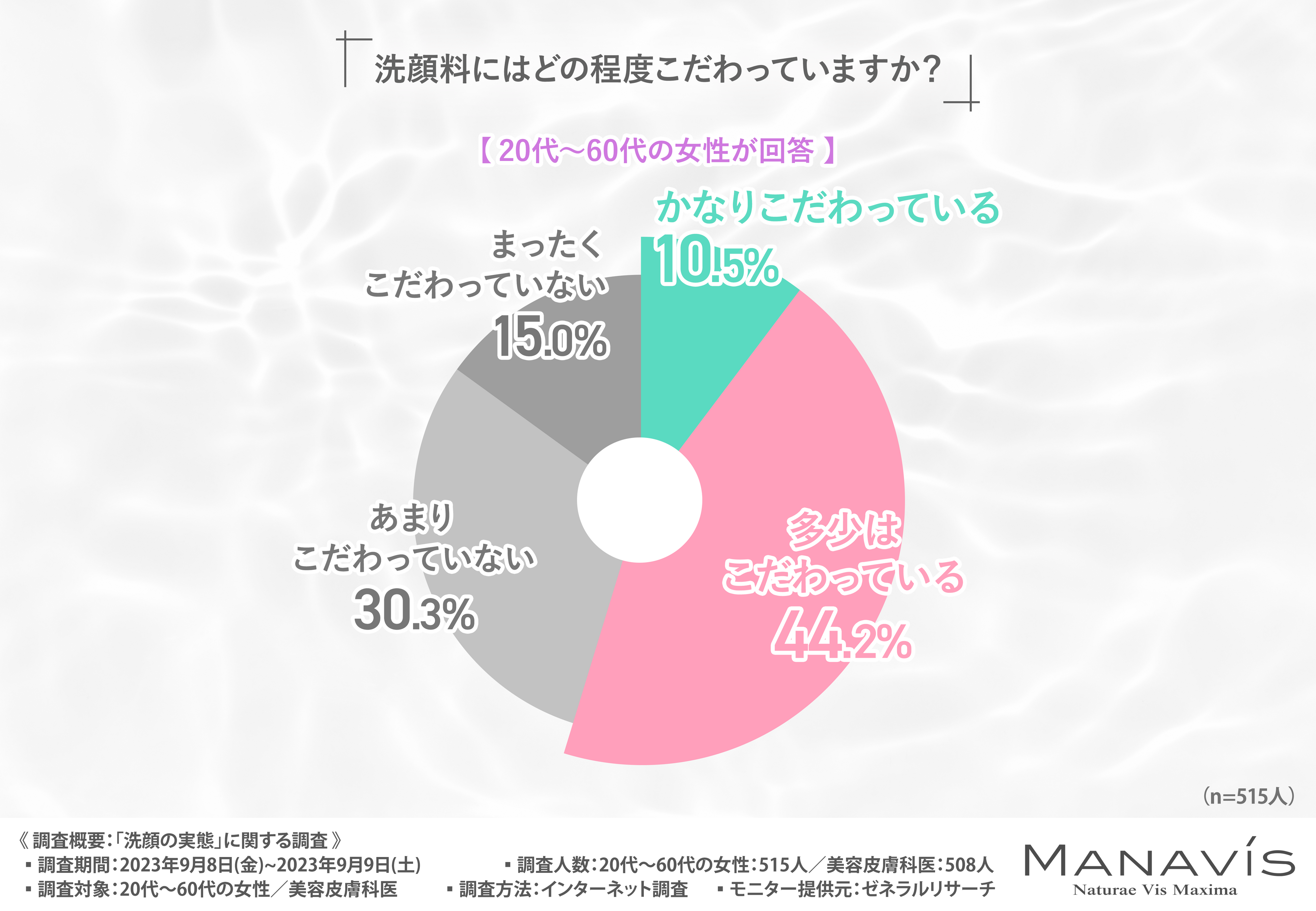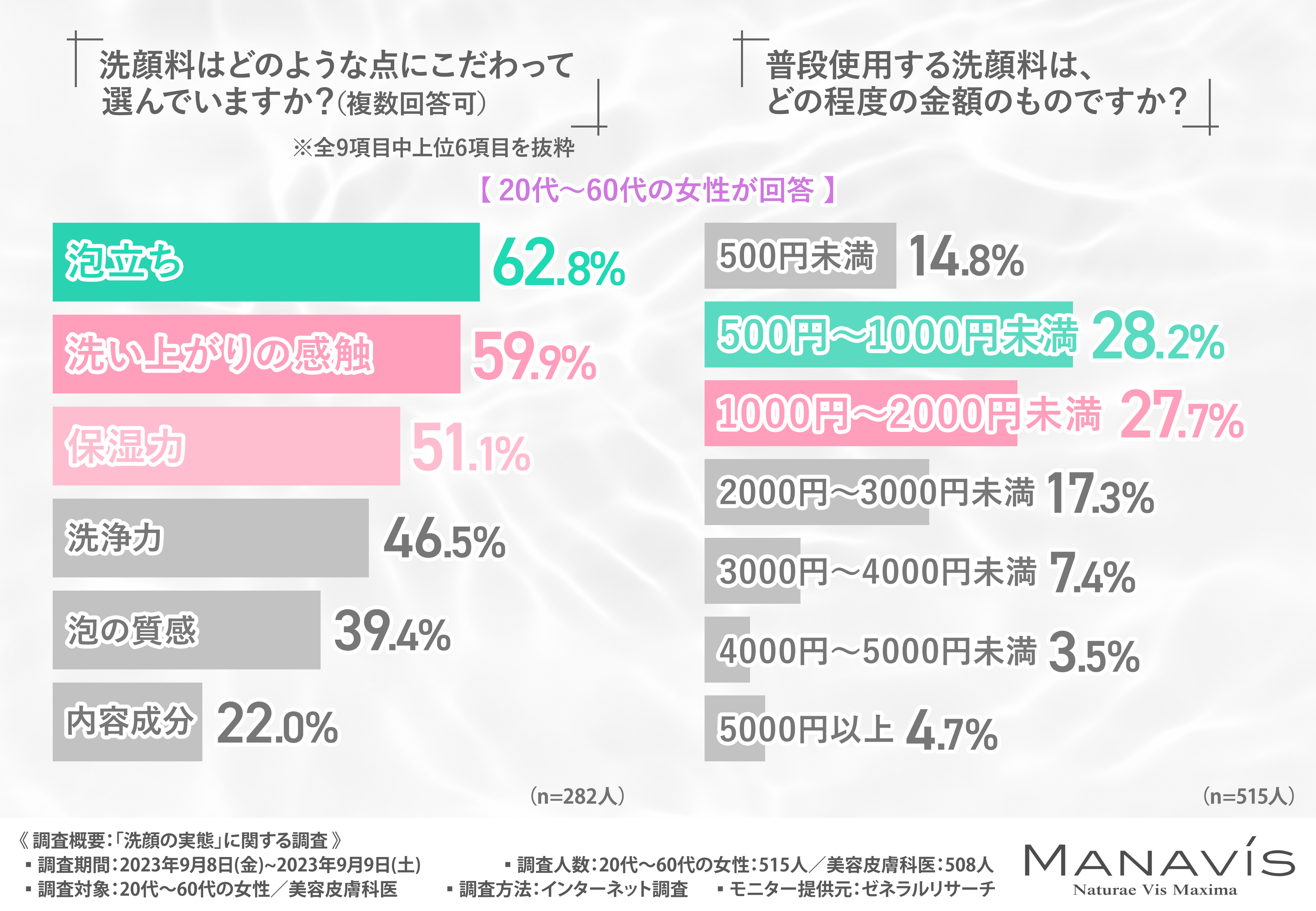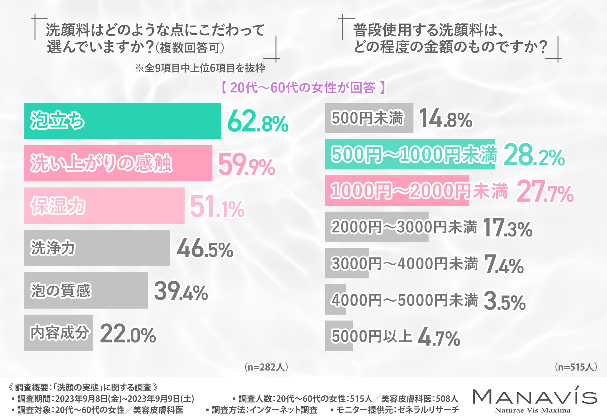 そこで今回「マナビス薬用スキンウォッシュ」(https://manavis.store/products/018)を展開する株式会社マナビス化粧品は、20代〜60代の女性と美容皮膚科医を対象に、「洗顔の実態」に関する調査を実施しました。