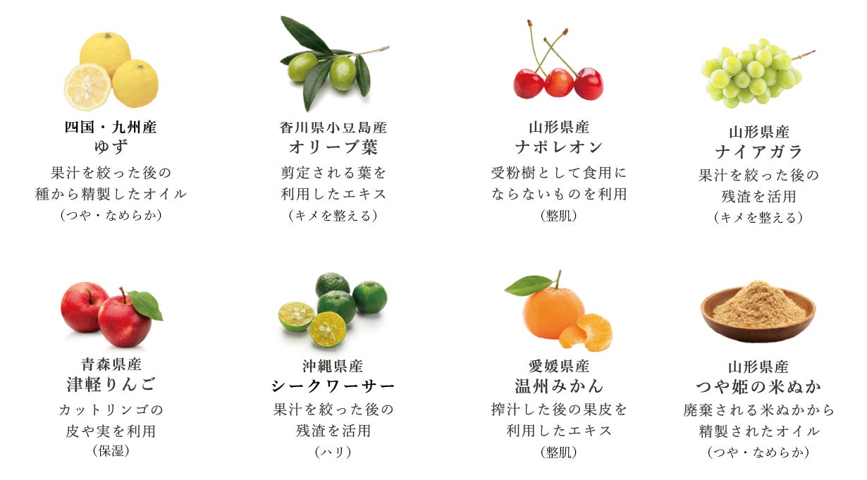 商品の生産過程や栽培過程で出た、これまでは廃棄されてきたもの、それは美容の世界から見たらむしろ宝の山です。それを捨てることなく、化粧品原料としてアップサイクルさせた美容保湿成分を厳選して積極的に配合しています。