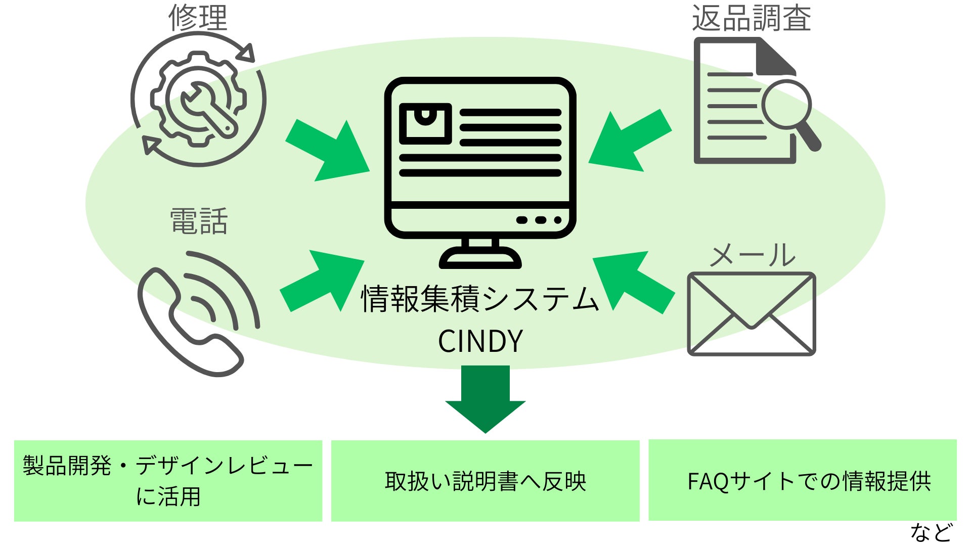 ウェブサイトやメール、電話など様々なルートから寄せられる顧客からの 製品に関する問い合わせ等の情報を情報集積システム「CINDY」によって 一元的に管理し、これを踏まえて取扱説明書や自社ウェブサイト上の製品 FAQ を頻繁に見直すことで、自社として消費者の関心事項や質問・要望を 的確に整理・把握するとともに、消費者の製品に関する理解度を高めるため の情報提供を通じて、誤使用事故の防止を図っている。