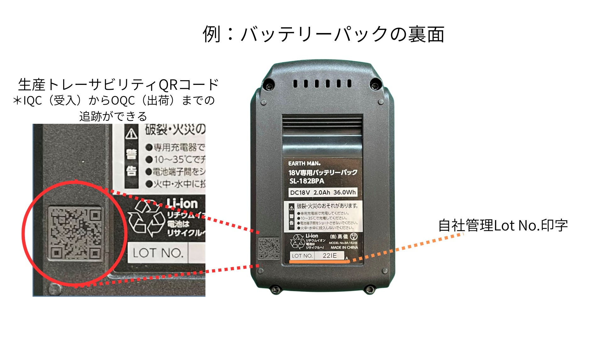 万一、製品事故や不具合が発生した場合に備え、QR コードによる部品(バ ッテリーパック)レベルと製造ロットによる製品レベルでのトレーサビリ ティを確保するとともに、自社の LINE 公式アカウントを通じて対象者に 直接かつ迅速にリコール通知を行える体制を整備している。