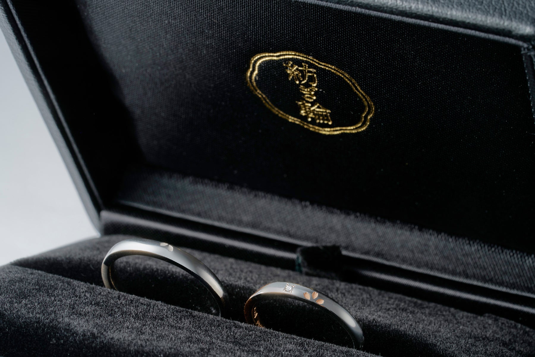 「微笑み」は、桜の模様をあしらったリングで、お互いのリングを重ね合わせると桜が浮かび上がる独自のデザインが特徴です。女性用のピンクゴールド部分は鏡面仕上げ、男性用のシャンパンゴールド部分はマット仕上げとなっており、刻み込んだ花びらが相まって美しい調和を生み出します。