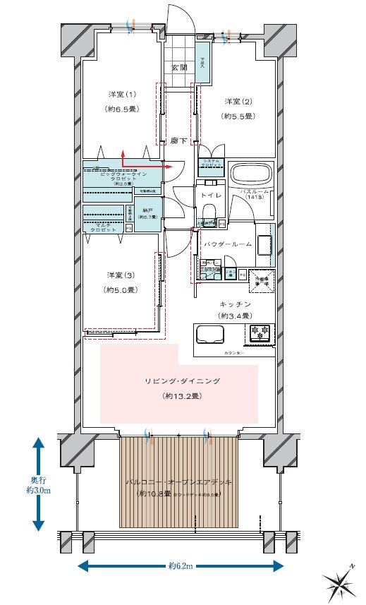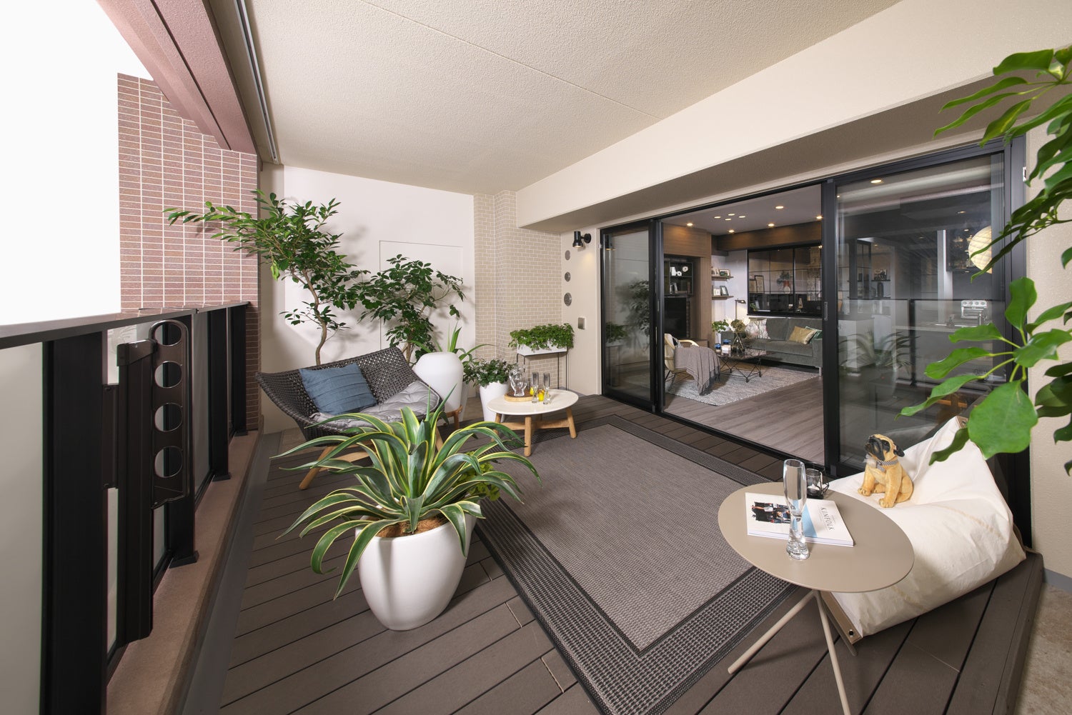 住空間における特徴の一つは、最大約3mの奥行きを誇るバルコニーです。ウッド調デッキを敷いた開放感溢れる空間となる「オープンエアデッキ」や「オープンエアスペース」は、窓を開けるとリビング・ダイニングと一体利用が可能となり、家族団らんのひと時や子供が遊ぶスペース等、暮らしの可能性を広げると高い評価をいただきました。