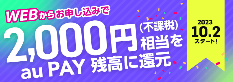 auエネルギー&ライフおよび沖縄セルラー電話は2023年10月2日から、WEBでauでんきに新規お申し込みの上、ご利用開始いただいたお客さまを対象に、2,000円相当のau PAY 残高を還元するキャンペーンを実施しています。この機会にぜひauでんきのご利用をご検討ください。