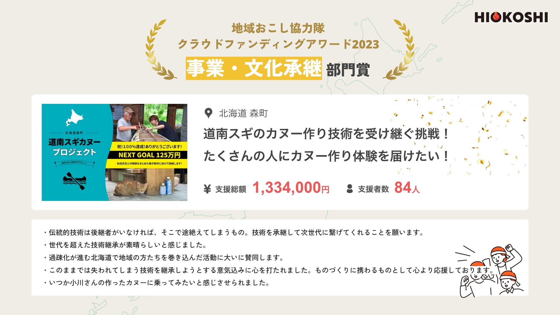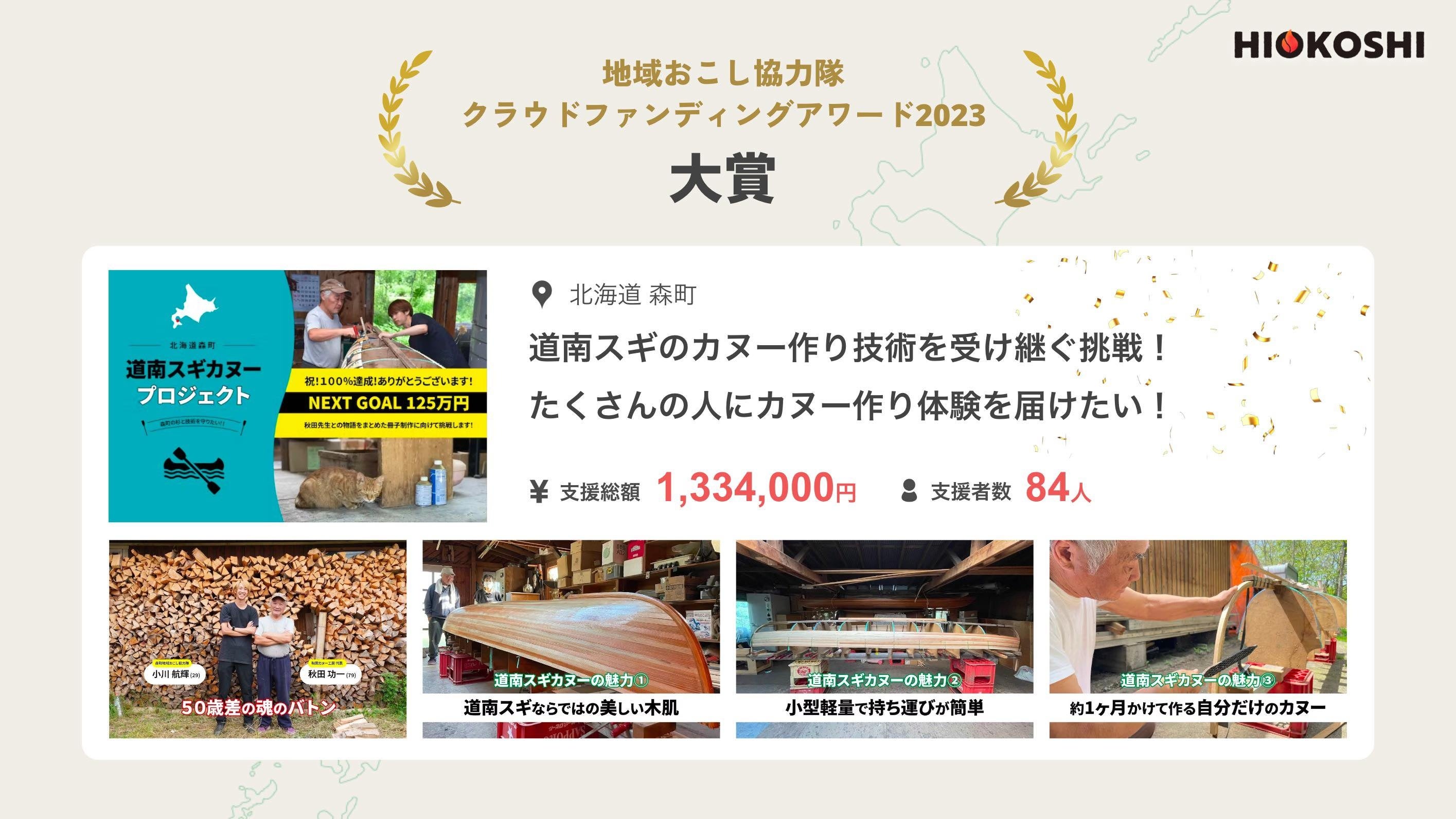 弊社がクラウドファンディングの立ち上げや資金調達の伴走支援を行ったプロジェクト『道南スギのカヌー作り技術を受け継ぐ挑戦!たくさんの人にカヌー作り体験を届けたい!』が、事業・文化承継部門賞を受賞し、部門を総合した大賞に選ばれました。
