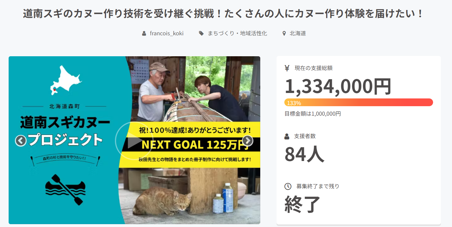 今回受賞したクラウドファンディングは、北海道森町の地域おこし協力隊である小川フランソワ航輝さんが立ち上げた、地域に伝わる道南スギを使ったカヌー作りの技術継承を目指すプロジェクトです。