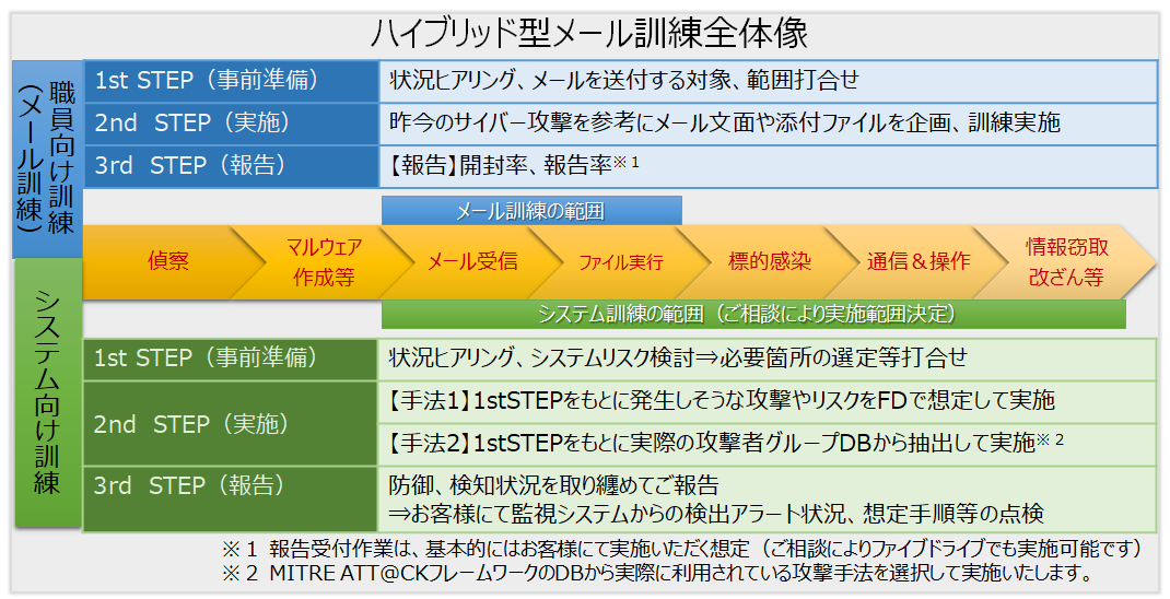 上記を踏まえ、人とシステムによるサイバー攻撃対応能力の現状把握をハイブリッドでおこなえるメール訓練サービスをリリースすることにいたしました。