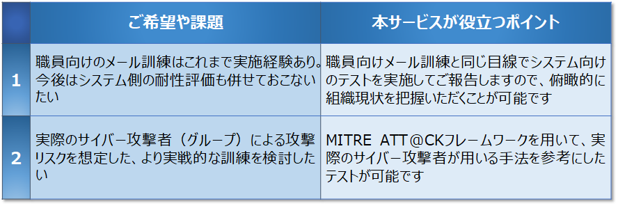 本サービスは、従来の“職員向け標的型攻撃メール訓練”と“ペネトレーションテストの技術を活かしたシステム耐性テスト”を組み合わせた実戦的な訓練を行うサービスです。そのため、これまでメール訓練やペネトレーションテストを実施された経験を持ち、より実戦に近い内容でのテストを探しているお客様におすすめです。