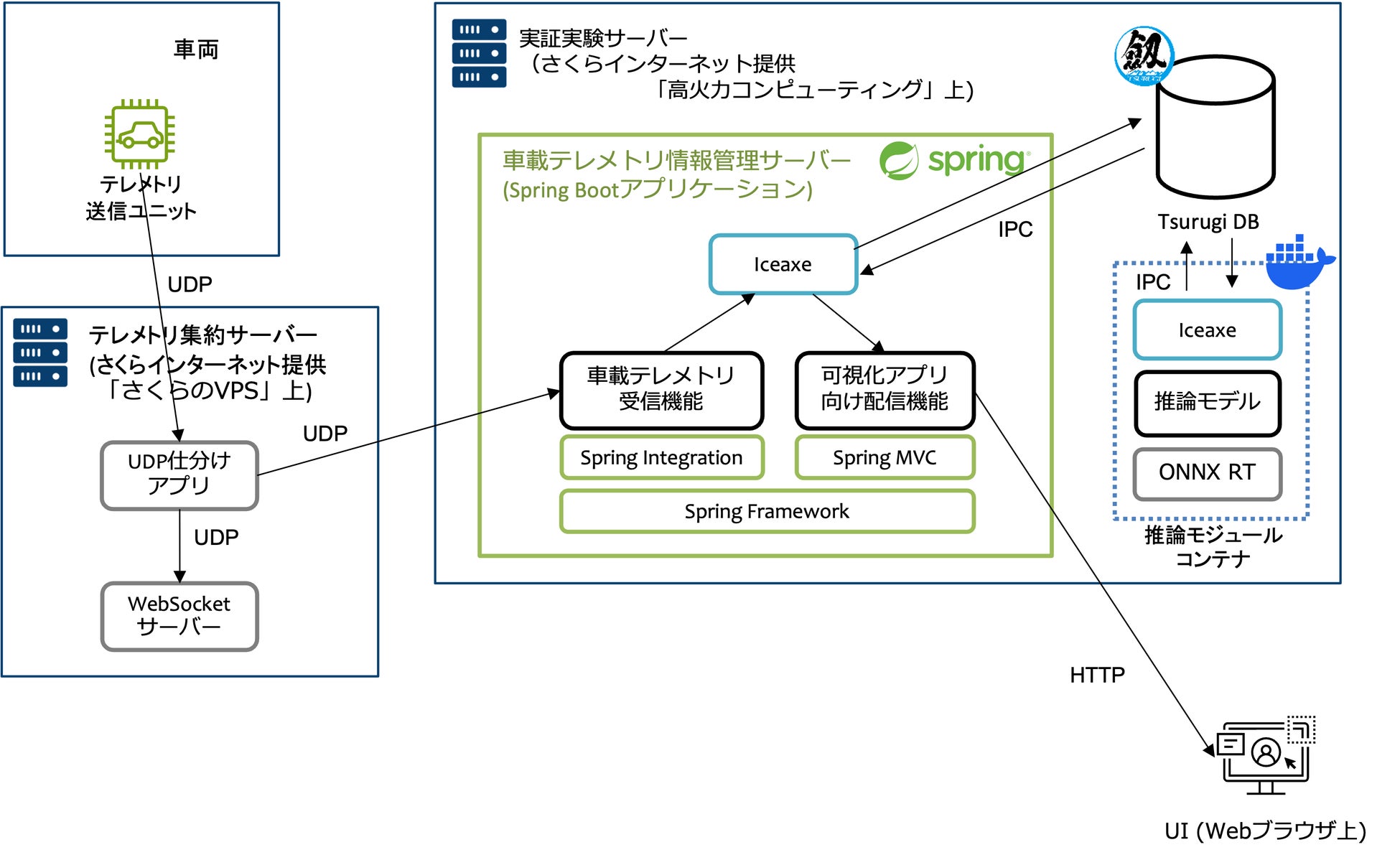 車両のテレメトリ送信ユニットからさくらインターネット提供の「さくらのVPS」上に構築された実証実験サーバーに送られたテレメトリデータは、「劔“Tsurugi”」のJavaライブラリのIceaxe経由で前処理を行いながら書き込みを行い、特徴量テーブルを作成します。そのデータを使って、同サーバー内に構築された推論モジュールコンテナで推論処理を行い、あらかじめ準備された機械学習プログラムと連携されて、学習結果が「劔“Tsurugi”」に登録されます。