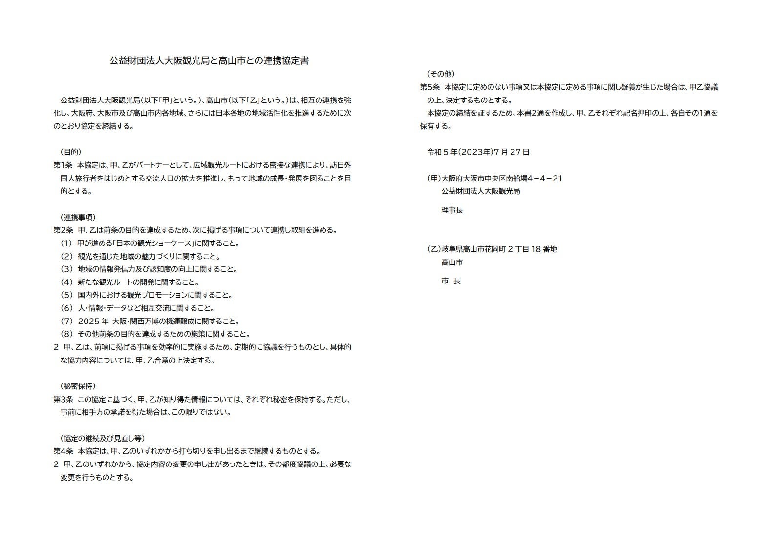 令和5年7月27日、高山市内にて、公益財団法人大阪観光局(所在地:大阪市中央区)と高山市との連携協定締結式が開催されました。