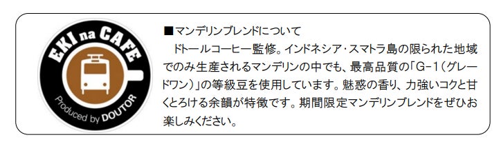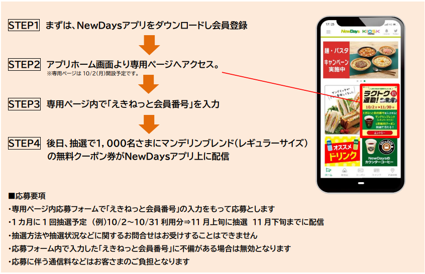 〇キャンペーン期間中、対象の「JRE POINT特典チケット」(えきねっとチケットレスサービス)をご利用のお客さまにはNewDaysで期間限定発売中の「マンデリンブレンド(レギュラーサイズ)」の無料クーポン券が抽選で当たります (NewDaysアプリのエントリーが必要です)。