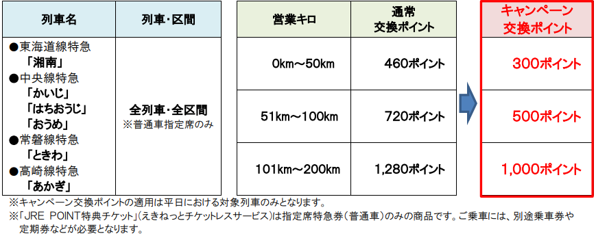 ○例えば、特急「かいじ」で新宿駅~立川・八王子駅間をご利用の場合、平日に限り、通常460ポイントのところ300ポイントでご乗車いただけます。