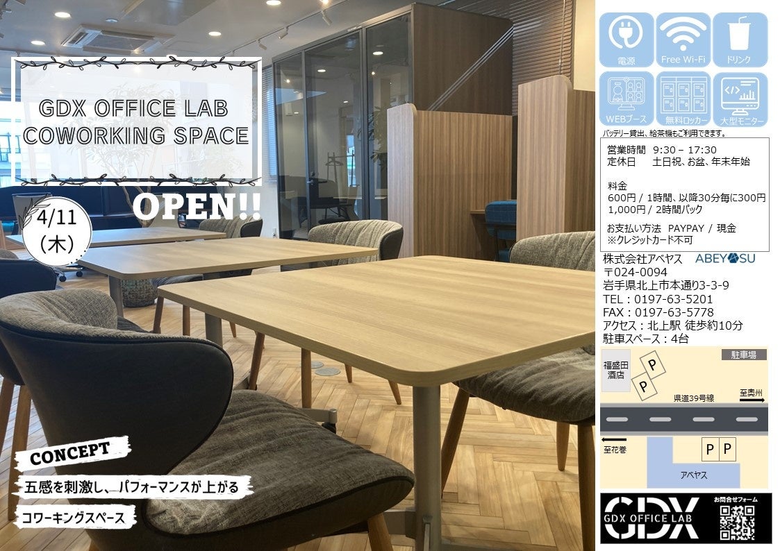 岩手県北上市 アベヤス新社屋【GDXオフィスラボ】をコワーキングスペースとして4月11日(木)にオープン!北上市内の民間事業として初!!※