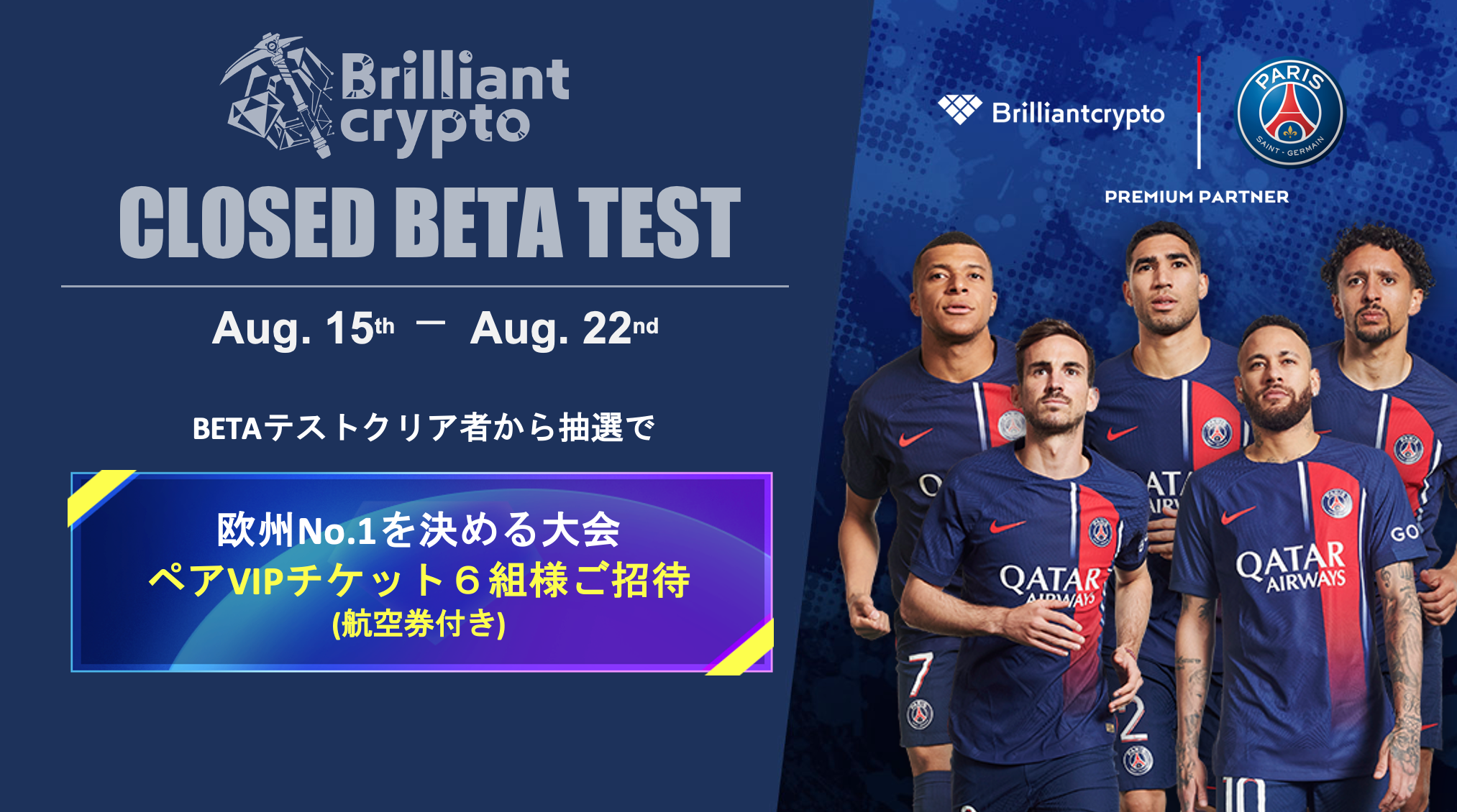 宝石の採掘で利益を得る新ブロックチェーンゲーム『Brilliantcrypto』にて、2023年8月15日から実施するβ版テストをクリアした方の中から抽選で、欧州No.1を決める大会のパリ・サンジェルマンのホーム試合観戦ペアVIPチケット(航空券付き)6組様にプレゼント。