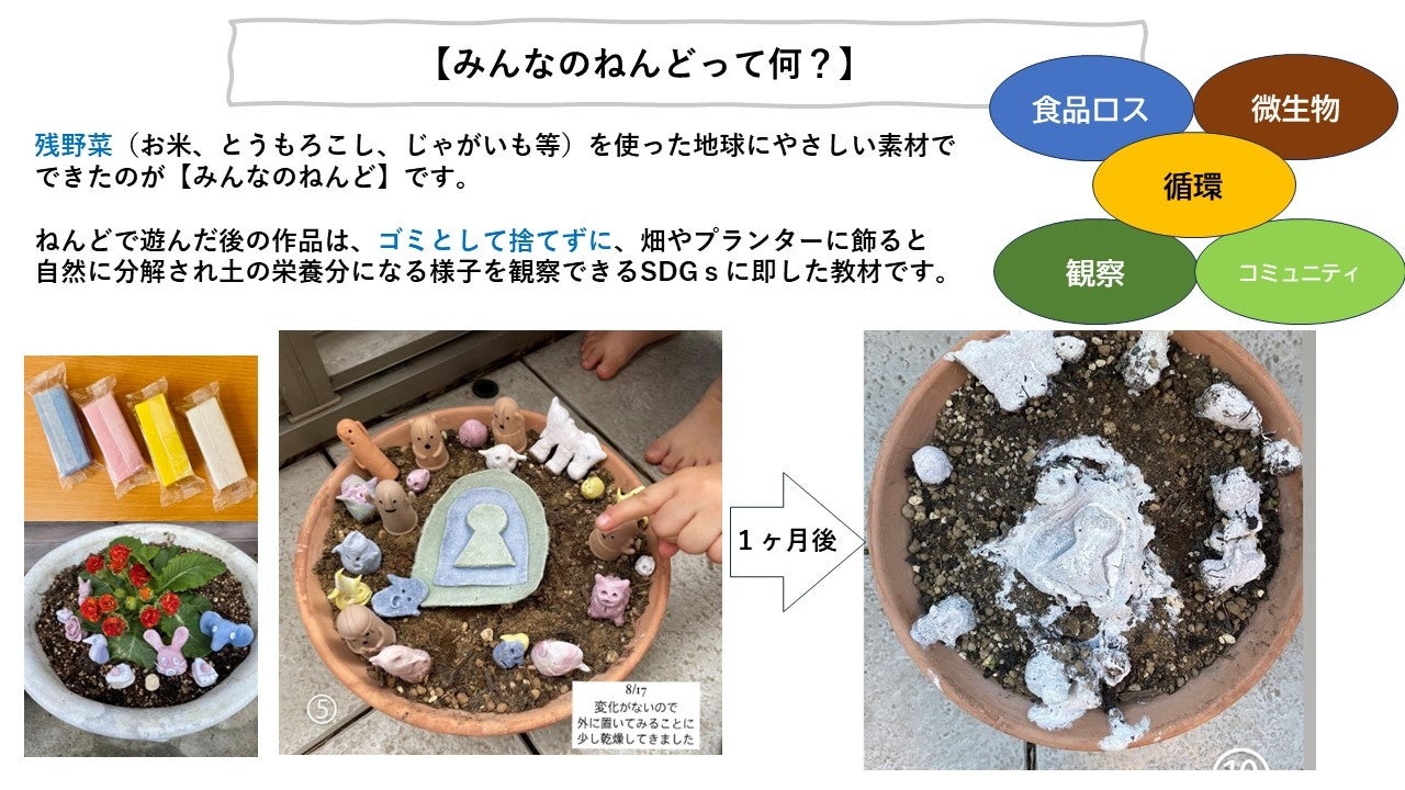 残野菜(お米、とうもろこし、じゃがいも等)を使った地球にやさしい【みんなのねんど(SDGs粘土)】でねんど作品をつくり、その作品を畑やプランターや池などに飾り、自然に戻っていく様子を観察することで、子ども達にSDGsを学んでもらうコンテストです。