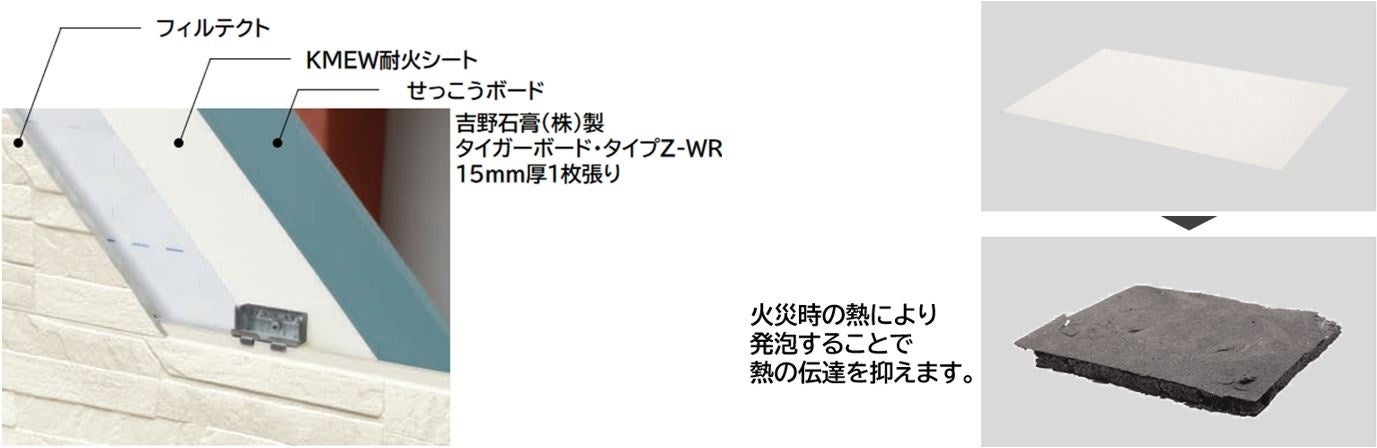 日本では建設業就業者の減少および高齢化が進み、工事作業者の負担軽減や工期短縮が求められてきました。これらを解決する方法のひとつとして、ケイミューは2020年3月に「KMEW耐火シート」を発売。わずか0.7mmの厚さながら、火災時の熱により発泡し、熱の伝達を抑制することで耐火性に寄与。施工性に優れた外壁耐火構造を提供します。