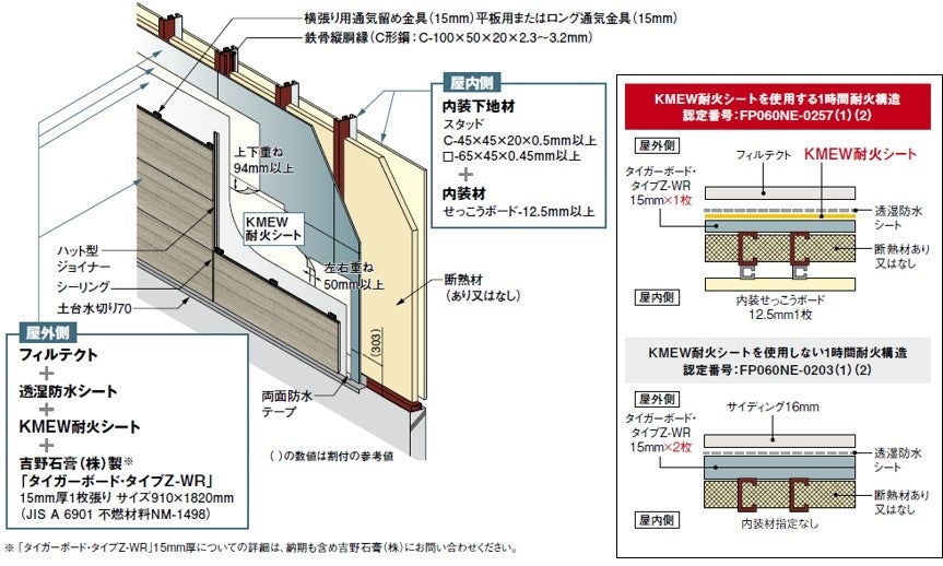 従来の外壁1時間耐火構造認定の場合、屋外側にせっこうボード2枚張りが必要でしたが、KMEW耐火シートを用いた認定は、屋外側のせっこうボードのうち1枚をKMEW耐火シートに置き換え、外壁の工期を短縮。認定は、屋内側の内装せっこうボードを含めた構造で取得しています。15mm厚のせっこうボードが約20kg/枚なのに対し、KMEW耐火シートは約1.6kg/枚と軽量。厚みもわずか0.7mmであるため、運搬性、加工性、施工性に優れ、工事作業者の負担を軽減し、工期短縮に貢献します。