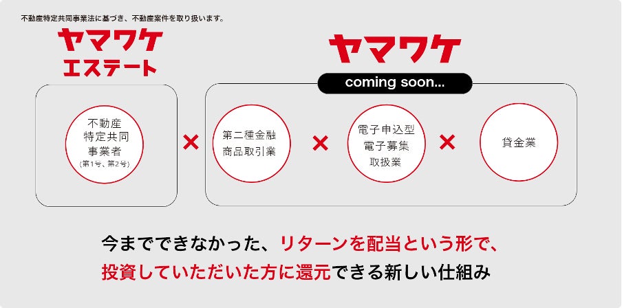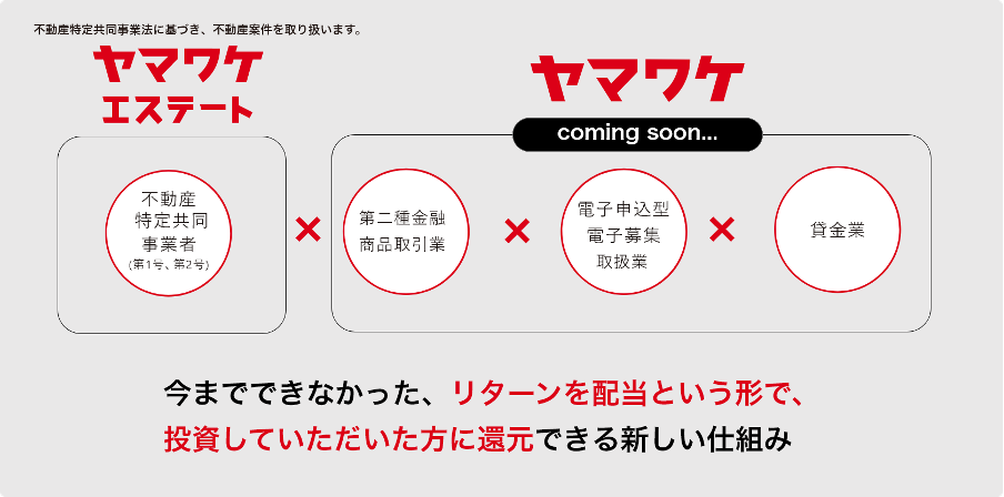 投資・配当型クラウドファンディング「ヤマワケ」は、第二種金融商品取引業※の登録をしているWeCapital社が運営することで、クラウドファンディングを通じて出資した事業者の業績が上がる場合には「リターンを配当する」という形で投資家様へ還元することができ、将来的には不動産以外の様々な商品も証券化することを目指す、新しい仕組みを持ったプラットフォームです。