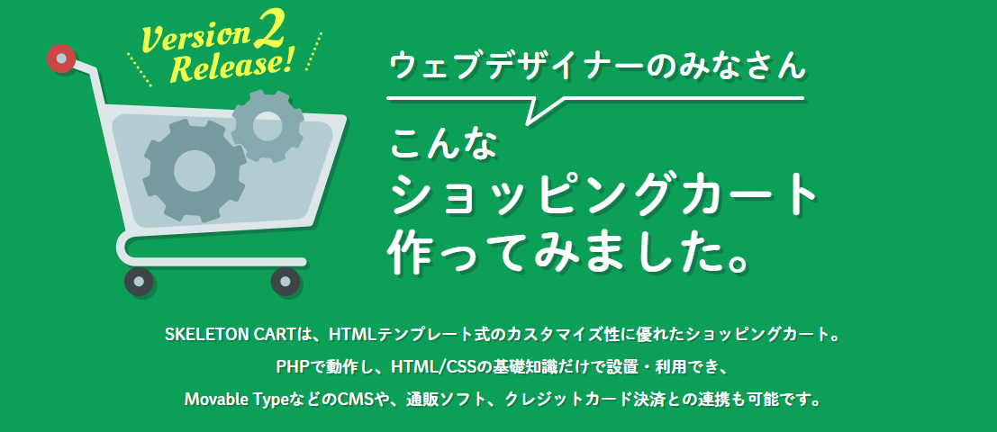 SKELETON CARTは、HTMLテンプレート式のカスタマイズ性に優れたショッピングカートで、PHPで動作しHTML/CSSの基礎知識だけで設置・利用可能。