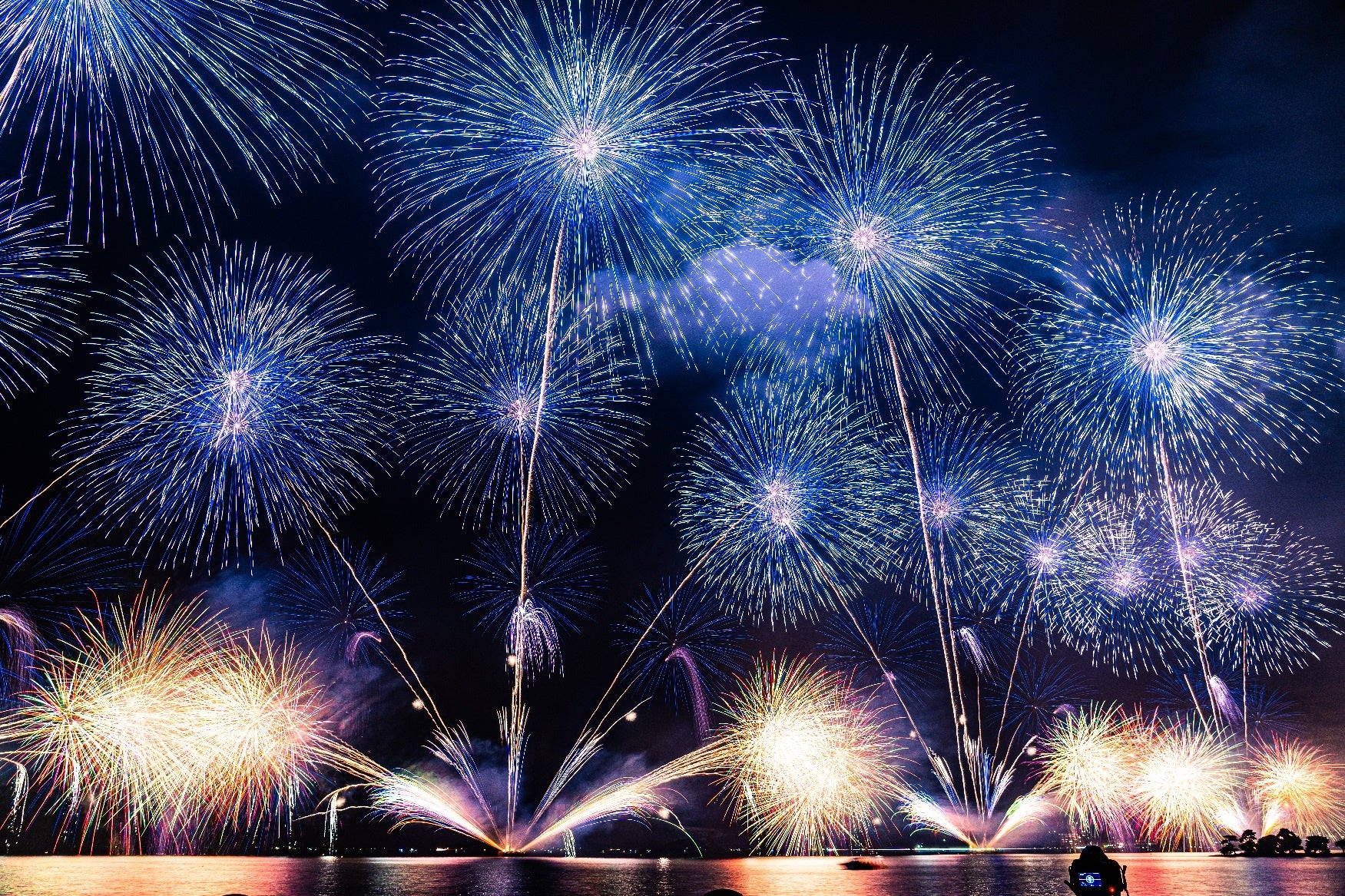 昨年に引き続き4台の打ち上げ台船から、宍道湖の湖面と夜空を広範囲かつダイナミックに活用し、過去最大となる2万1千発の花火を打ち上げました。
