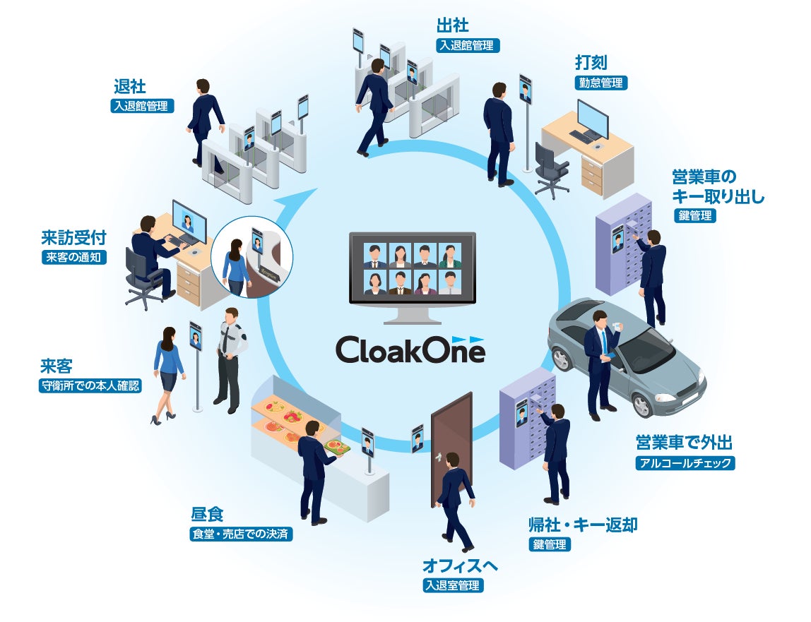 食堂決済、映像解析、座席・会議室予約・受付、アルコールチェック管理などの各システムとCloakOneの活用シーンを展示します。