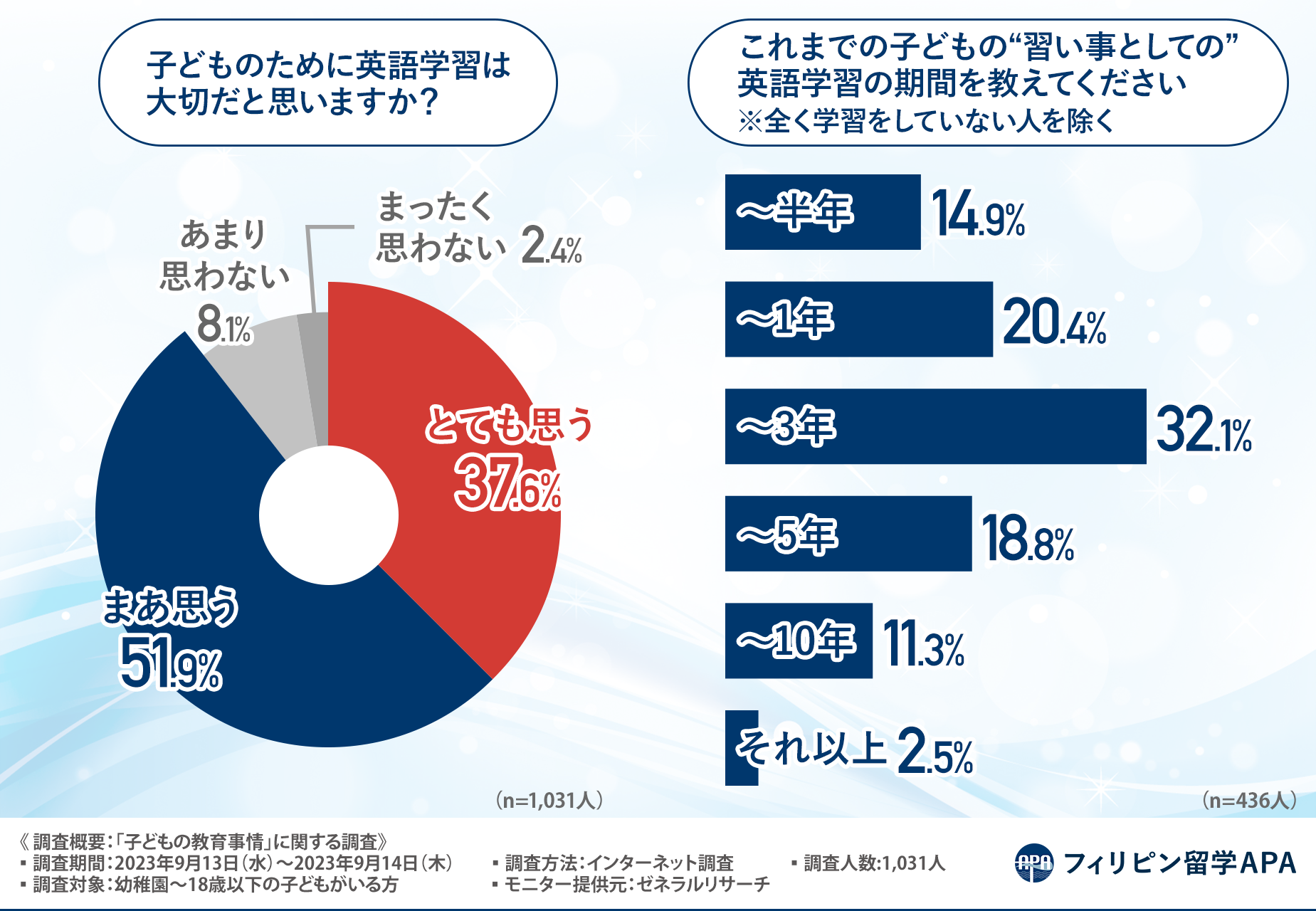 ここまでの調査で、およそ9割の親御さんが、子どものために英語学習は大切だと認識していることが明らかになりました。