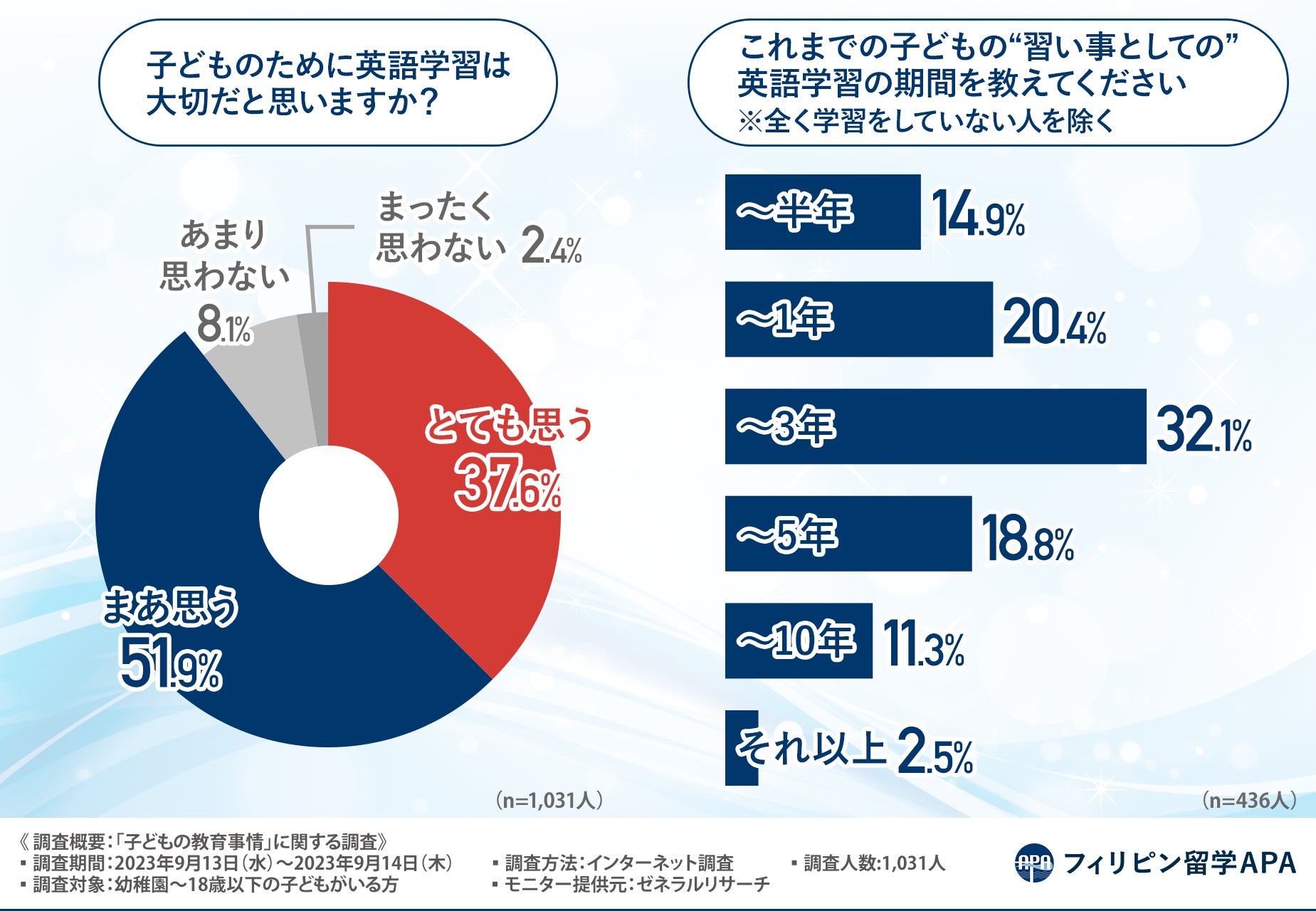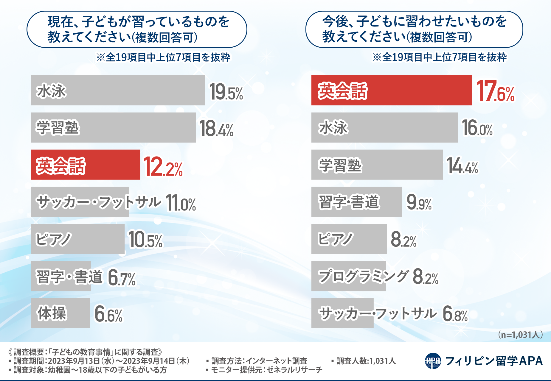 今回、海外語学留学を支援する「フィリピン留学APA(https://phl-ryugaku-apa.com/)」を手掛けるALEBA株式会社は幼稚園から18歳以下の子どもがいる方を対象に、「子どもの教育事情」に関する調査を実施しました。