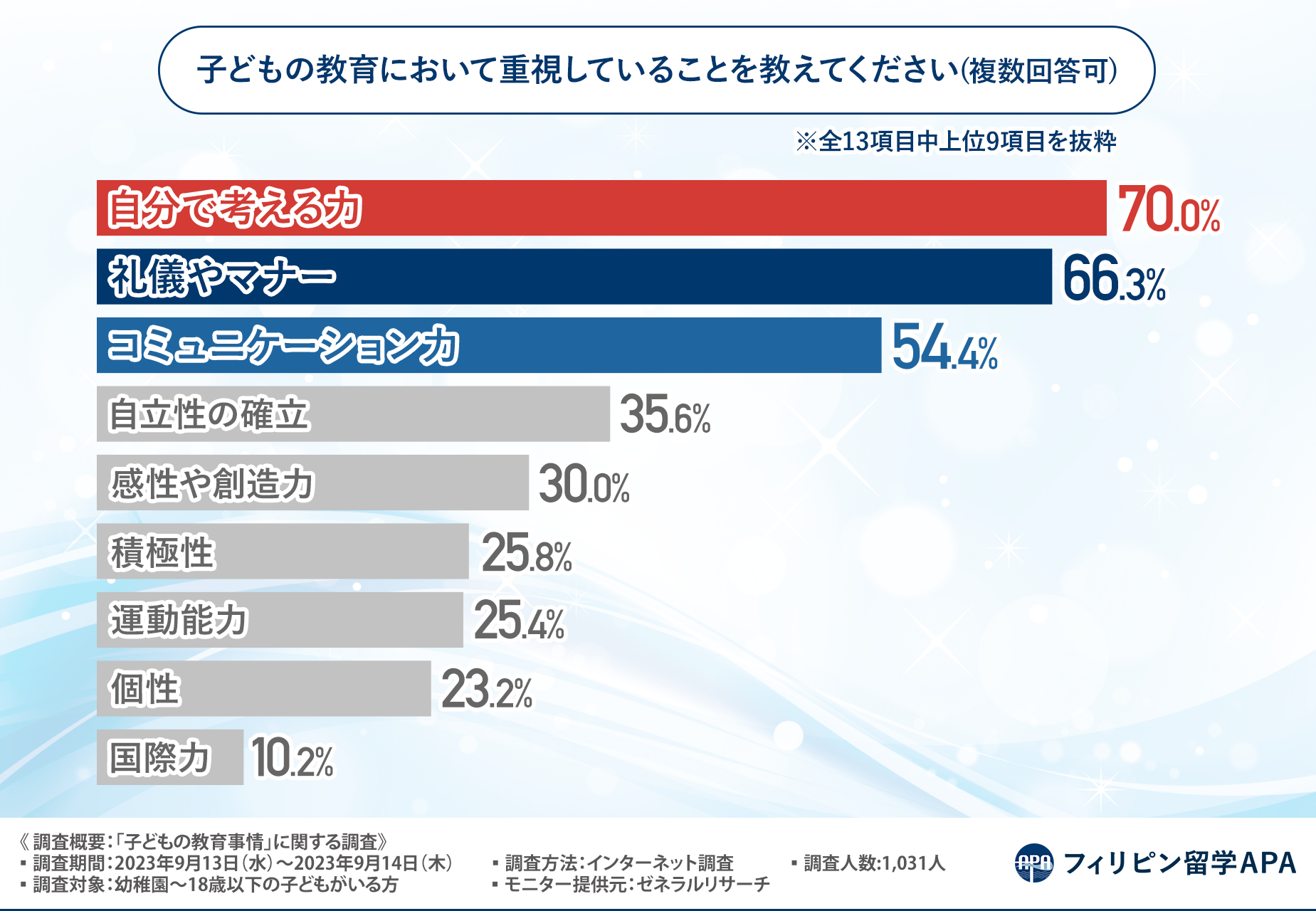 「子どもの教育において重視していることを教えてください(複数回答可)」と質問したところ、『自分で考える力(70.0%)』と回答した方が最も多く、次いで『礼儀やマナー(66.3%)』『コミュニケーション力(54.4%)』『自立性の確立(35.6%)』『感性や創造力(30.0%)』と続きました。