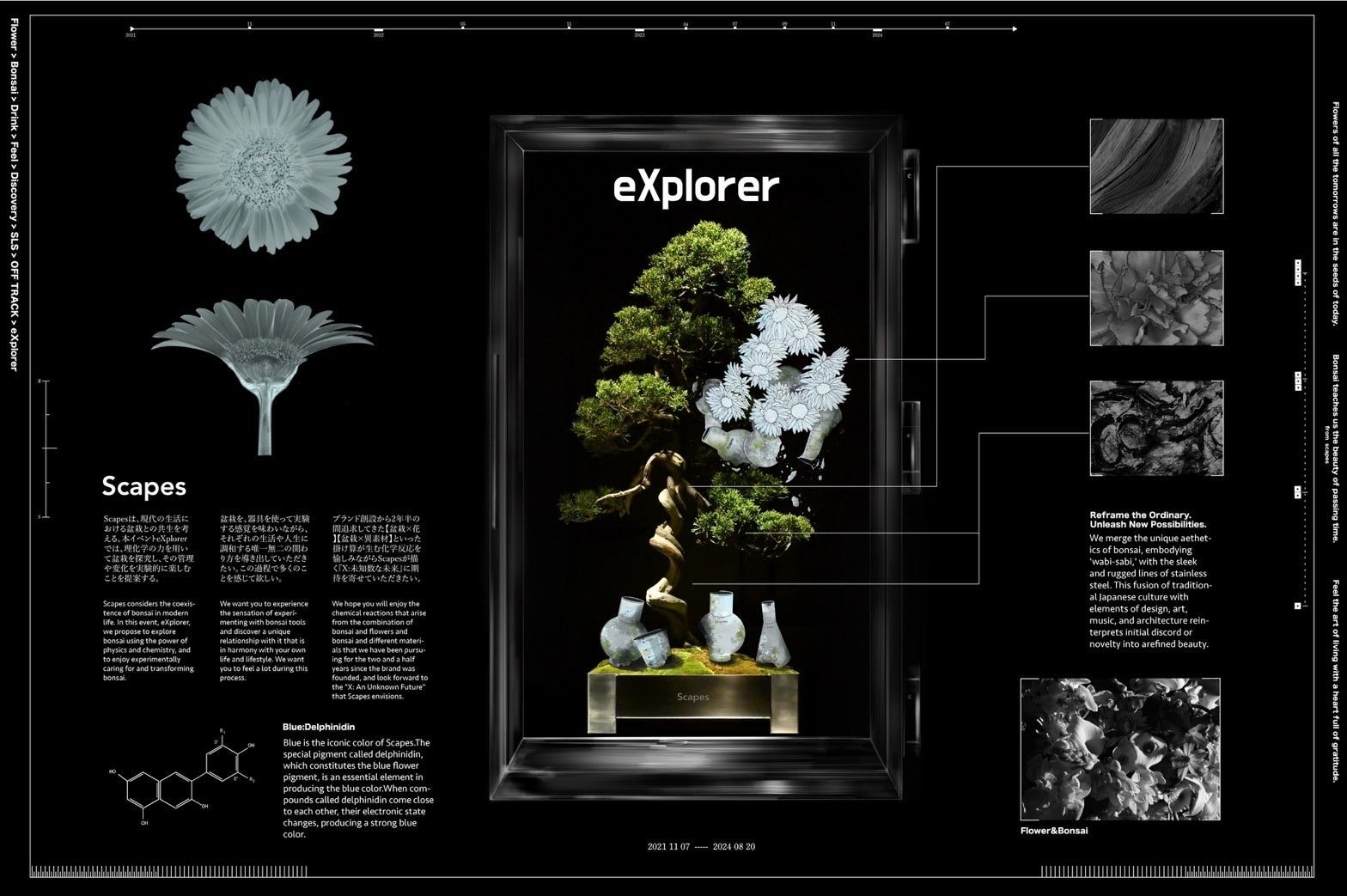 侘び寂びを感じる"唯一無二の盆栽の世界観"に、ステンレスの無機質で無骨な質感と直線を混合させる。先人達が創り上げてきた日本文化"盆栽"。盆栽と花との関わり方、デザイン・アート・音楽・建築、様々なコンテンツとも融合し、違和感や発想を"美しさ"へ変える。