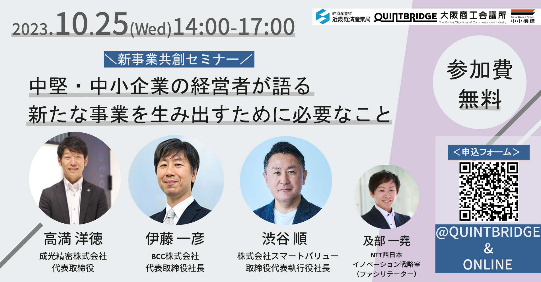 共催:NTT西日本 QUINTBRIDGE、大阪商工会議所、独立行政法人中小企業基盤整備機構 近畿本部(予定)