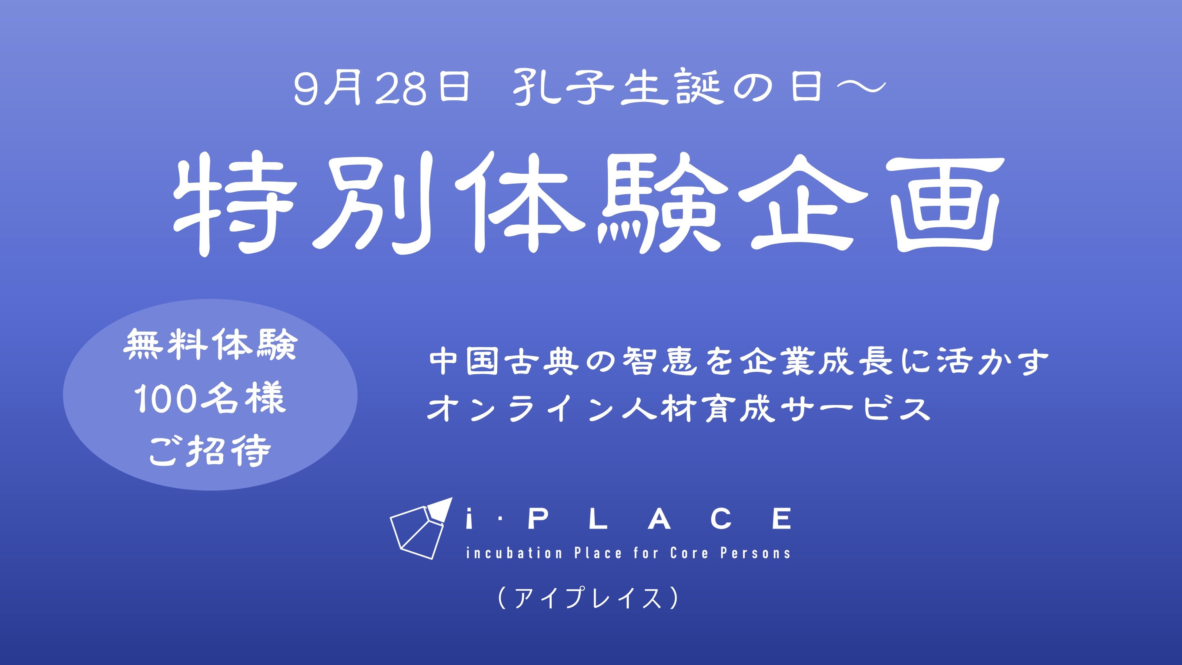 多くの企業が10月からの事業年度下期の開始を控えた9月28日に、孔子生誕の日を迎えます。この特別な日に、「i・PLACE」は特別体験企画を開始します。費用負担がなく、組織単位でプログラムを体験していただけるようにしました。この特別体験企画を通じて、中国古典の教えを活かしていくことが企業にとってどれだけ有益かを実感していただければ幸いです。