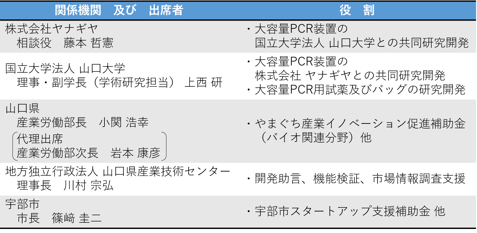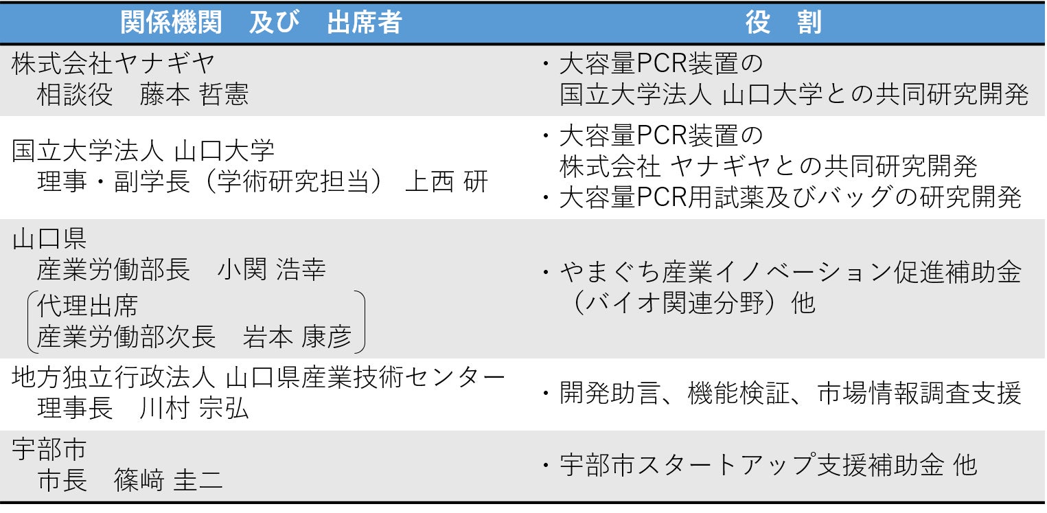左から、国立大学法人 山口大学、ヘリックスエクステンション株式会社(取締役・代表取締役)、宇部市、株式会社ヤナギヤ、山口県、地方独立行政法人 山口県産業技術センター