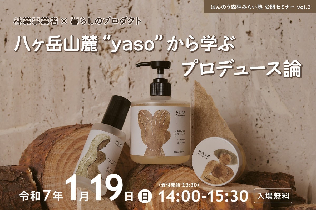 2025年1月19日(日)、飯能市市民活動センター多目的ホールにて公開セミナー「林業事業者×暮らしのプロダクト 八ヶ岳山麓 “yaso”から学ぶプロデュース論」を開催します。
