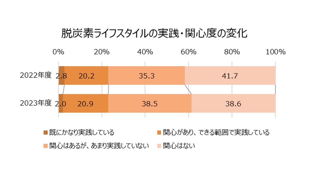 「脱炭素ライフスタイル全般について、ご自身に最も当てはまるものを回答してください。」という問いに対して、「既にかなり実践している」、「関心があり、できる範囲で実践している」を合わせた、脱炭素ライフスタイル行動を実践している人の割合は、2022年度調査と変わらず23%でした。また、脱炭素ライフスタイルを実践している人の割合に「関心はあるが、あまり実践していない」を加えた、脱炭素ライフスタイルに関心がある人の割合は61%であり、2022年度調査の58%からわずかに増加しています。