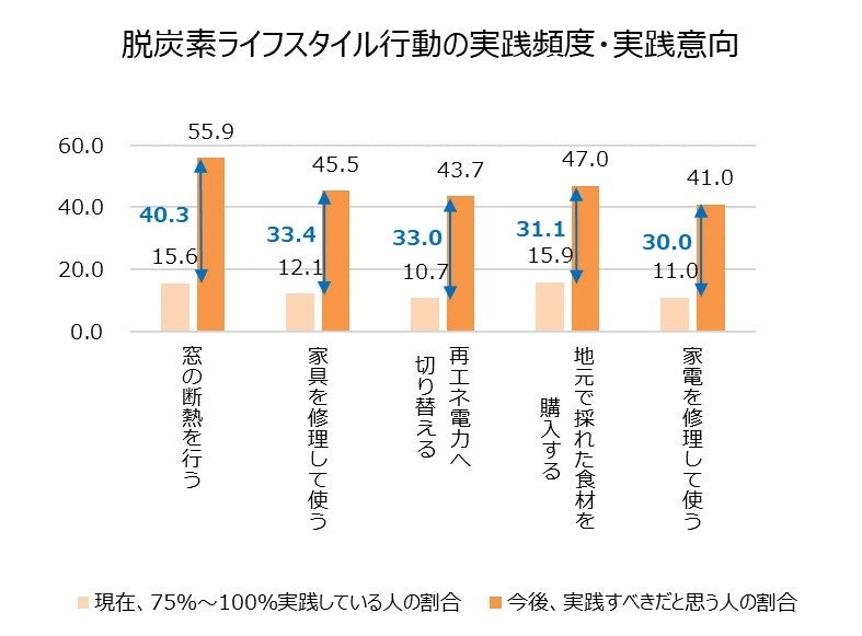 公益財団法人京都市環境保全活動推進協会(所在地:京都市伏見区深草池ノ内13、理事長:新川達郎)は、脱炭素ライフスタイル行動を広めるため、2022年度に引き続き、2023年度も京都市民1,000人を対象に脱炭素ライフスタイル行動の実態を調査しました。その結果、京都市民が「実践すべき」と答えた割合と「実践している」と答えた割合の差が大きい順に、1位は「窓の断熱を行う」、2位は「家具を修理して使う」、3位は「再エネ電力へ切り替える」、4位は「地元で採れた食材を購入する」、5位は「家電を修理して使う」であることがわかりました。