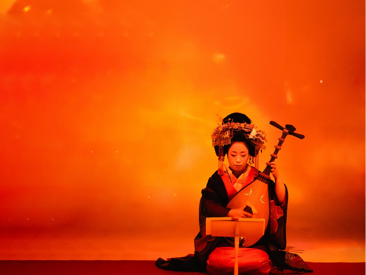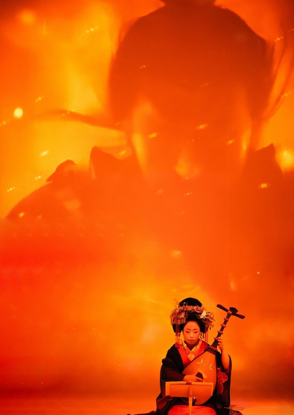 そして葵太夫による「本能寺」でフィナーレへ。観る人を圧倒する大迫力の映像美と、力強い琵琶の音色が空間いっぱいに響き渡り、物語の世界へと引き込まれてゆくような圧倒的な一体感を味わっていただけます。