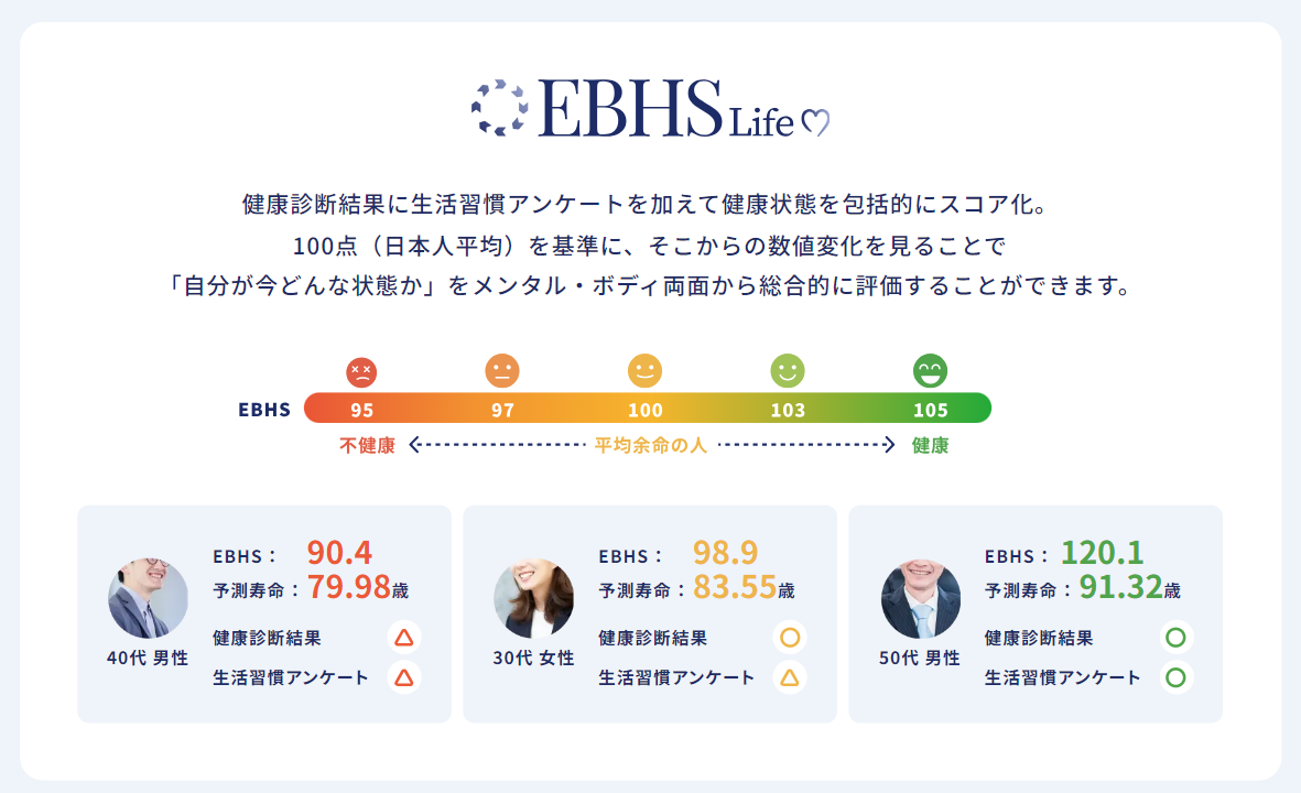 誰もが活き活きと暮らす社会の実現に向けて、医療費の削減と健康啓発を行ってきたエムスリーが、誰しもが理解できる単一の数値に昇華した健康指標が「EBHS Life」です。約5万人分の健康診断/生活習慣データと3,000件以上の寿命予測に関する論文レビューの結果をAIで解析し、科学的エビデンスに基づく健康状態の変化や余命予測を可能にしました。企業に義務付けられた従業員の健康診断結果を利用することで、余計な手間を掛けることなく健康状態を評価できます。また、余命をスコア化することにより、従来の健康指標と比べ、生活者の健康に対する意識や行動変容に対する強い働きかけが可能となることが期待されます。